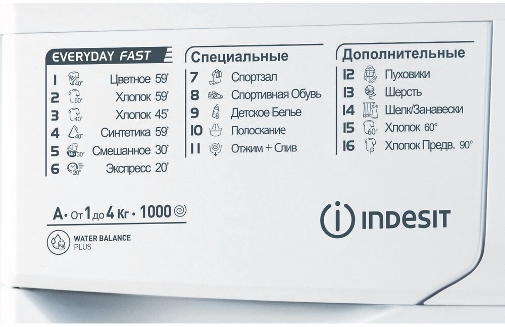 | Специальные программы | стирка деликатных тканей, экономичная стирка, предотвращение сминания, стирка джинсов, стирка спортивной одежды, супер-полоскание, быстрая стирка, предварительная стирка, программа удаления пятен |