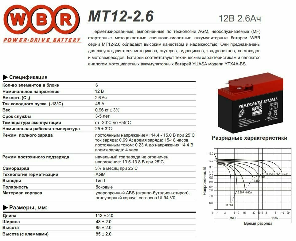 Аккумулятор WBR МТ12-2,6 — герметизированная, выполненная по технологии AGM, необслуживаемая (MF) стартерная мотоциклетная свинцово-кислотная аккумуляторная батарея. Обладает высоким качеством и надежностью. Она предназначена для запуска двигателя мотоциклов, скутеров, гидроциклов, квадроциклов, снегоходов и мотовездеходов. Батарея соответствует техническим характеристикам и является аналогом мотоциклетных аккумуляторных батарей YUASA модели YTX4A-BS.