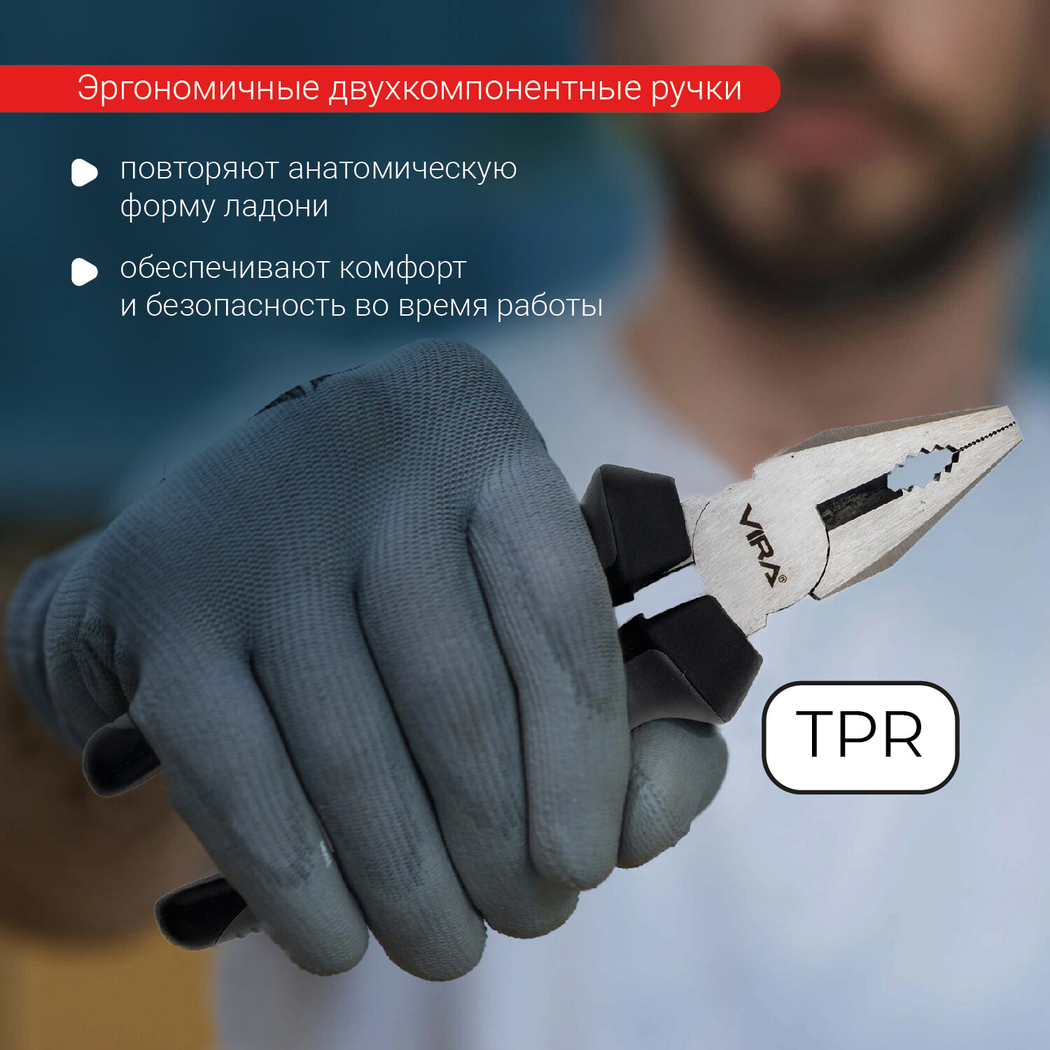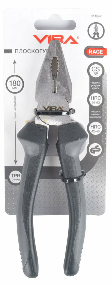 Эргономичные двухкомпонентные ручки повторяют анатомическую форму ладони и, тем самым, обеспечивают комфорт, безопасность во время работы. Рабочая часть плоскогубцев выполнена из высококачественной инструментальной стали CS55.
