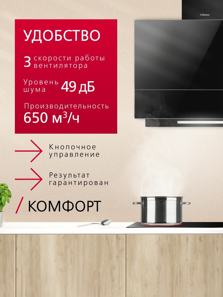Каминная вытяжка Hansa черного цвета объединяет в себе стиль и функциональность. Яркое LED-освещение и сенсорная система управления сделают работу на кухне намного проще и приятнее. 3 режима работы позволят отлично справиться с запахами на вашей кухне. А простое и понятное кнопочное управление прослужит долго, как и сама вытяжка.