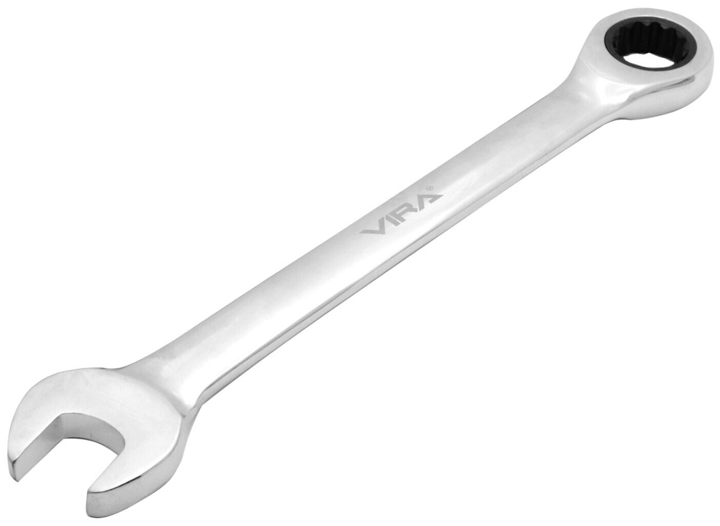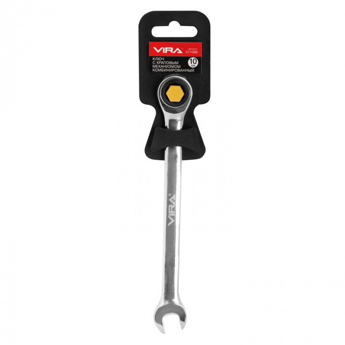 Ключ комбинированный с храповым механизмом VIRA 11 мм. В инструменте совмещены рожковый открытый ключ и накидной закрытый ключ. Комбинированный ключ VIRA 11 мм. оснащен трещоткой, что позволяет вам работать с креплением, не снимая инструмент с гайки после каждого рабочего движения. Ключ отводится назад механизмом обратного движения трещотки. Храповой механизм и все зубья - металлические. Для инструментов малых размеров используют механизм трещотки с 72-мя мелкими зубцами. Её минимальный угол поворота– 5 гр. Поверхность ключа зеркально отполирована. Помимо антикоррозийного эффекта, полировка привлекает к ключу внимание, когда он лежит среди прочих инструментов. Инструменты набора имеют овальное сечение, поэтому меньше натирают ладонь и пальцы во время работы.