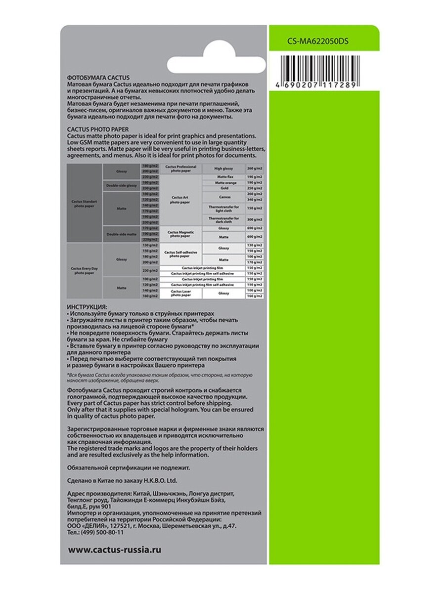 Бумага Cactus 10x15 подходит для двухсторонней печати фотографий, обеспечивающих удобство просмотра при хранении в специальном альбоме. Кроме того, с ее помощью можно создавать оригинальные открытки и другие материалы. Матовое покрытие обеих сторон не допускает возникновения бликов и позволяет получить естественные оттенки. Высокая плотность защищает отпечатки от смазывания за счет мгновенного впитывания и высыхания чернил.