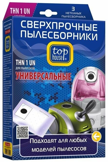 Top House TH 1 UN, мешки-пылесборники из нетканого материала, универсальные, для любых моделей пылесосов, с системой мегафильтрации. Обладают повышенной прочностью и влагостойкостью, не боятся острых предметов и соответствуют самым высоким стандартам качества. Top House TH 1 UN, мешки-пылесборники из нетканого материала, универсальные, для любых моделей пылесосов, с системой мегафильтрации. Обладают повышенной прочностью и влагостойкостью, не боятся острых предметов и соответствуют самым высоким стандартам качества.