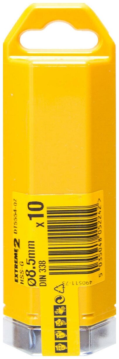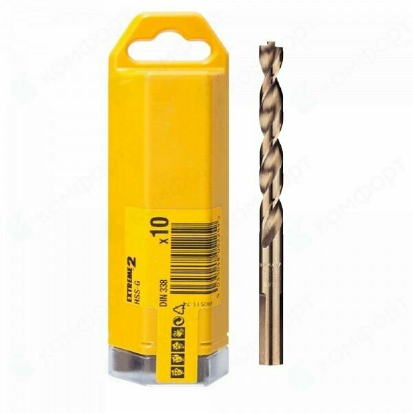 | Прочие особенности и свойства | Сверло Extreme 2 DeWalt DT 5554 используется в дрелях. Это праворежущее спиральное сверло типа N по DIN 338. Сверло Extreme 2 - это сверло повышенной прочности (на 50% прочнее, чем обычное HSS-R сверло). Оно сверлит быстрее и точнее других сверл, так как бурение начинается сразу после контакта с поверхностью материала, а клиновидная структура его сердечника обуславливает высокую стойкость к поломкам. Особое покрытие предохраняет сверло от перегрева и увеличивает срок его службы. ,,В упаковке 10 штук |