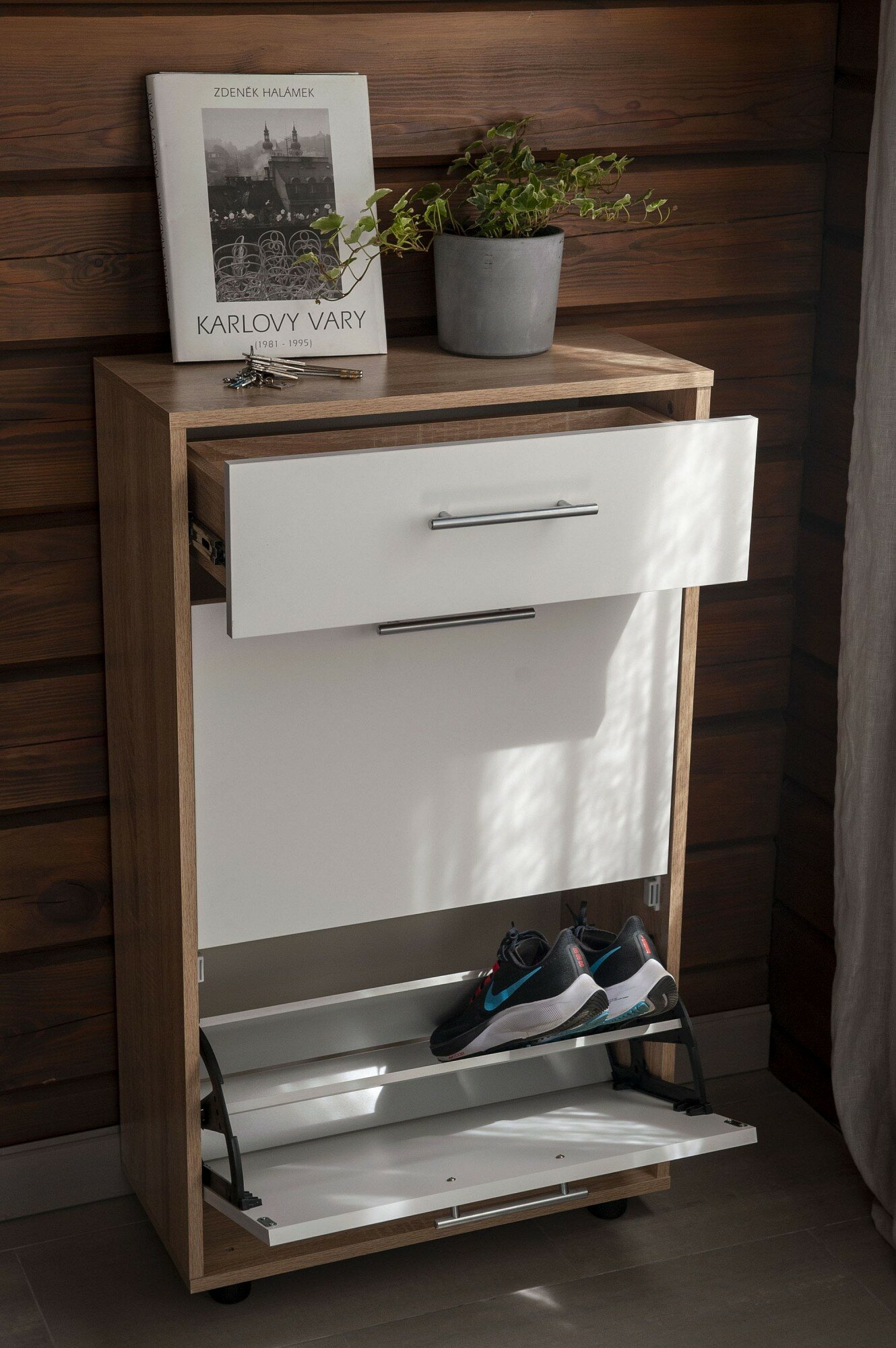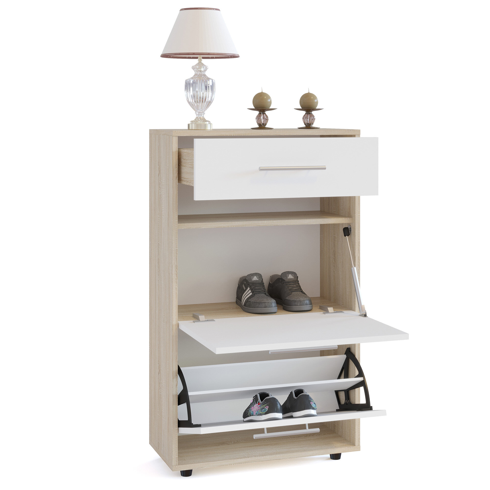 Габаритные размеры ВхШхГ 1040x600x283 мм. Обувница Моренго объединила в себе два закрытых отделения и выдвижной ящик. Нижний отсек оснащен откидным механизмом со специальными полками для удобного хранения обуви.