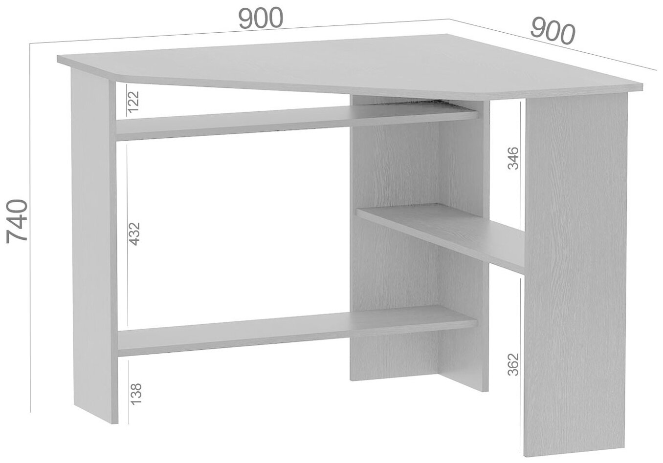 Габаритные размеры ВхШхГ 740x900x900 мм. Оригинальный угловой компьютерный стол Тавр позволит эффективно использовать пространство даже в небольшой комнате. На нескольких скрытых под столешницей полках удобно разместить книги и учебные материалы.