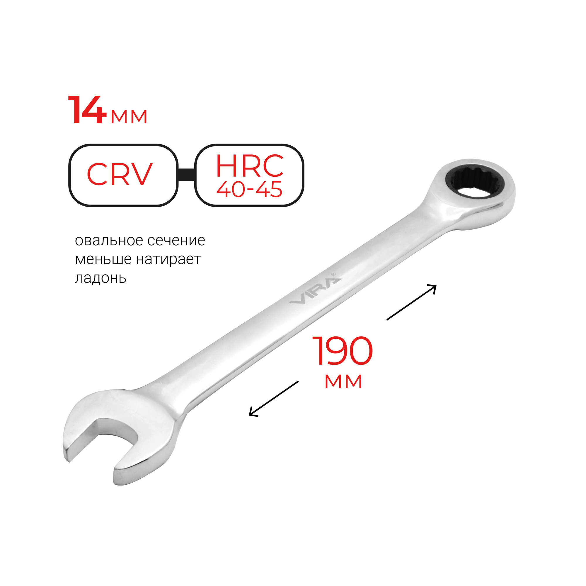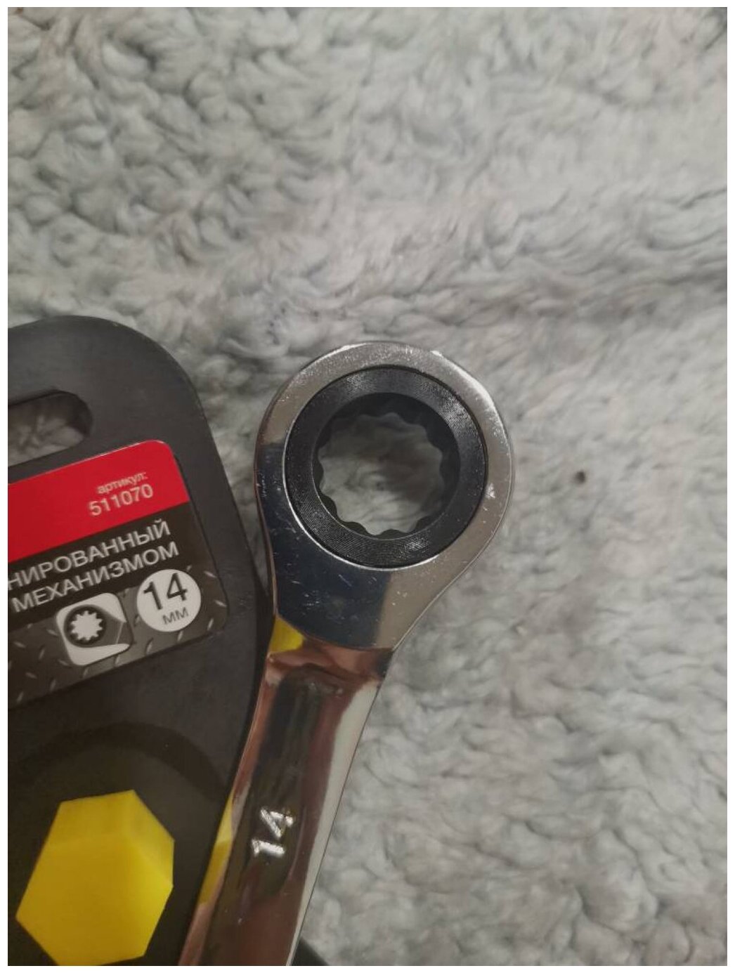 Оснащен трещоткой, что позволяет вам работать с креплением, не снимая инструмент с гайки после каждого рабочего движения. Ключ отводится назад механизмом обратного движения трещотки. Храповой механизм и все зубья - металлические. Всего их 72. Минимальный угол поворота механизма - 5 градусов: такая точность позволяет хорошо контролировать рабочий процесс. Поверхность ключа зеркально отполирована. Помимо антикоррозийного эффекта, полировка привлекает к ключу внимание, когда он лежит среди прочих инструментов.