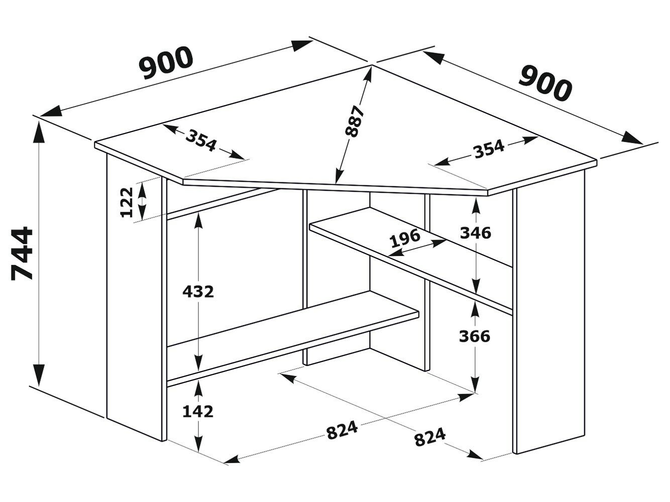 Габаритные размеры ВхШхГ 740x900x900 мм. Оригинальный угловой компьютерный стол Тавр позволит эффективно использовать пространство даже в небольшой комнате. На нескольких скрытых под столешницей полках удобно разместить книги и учебные материалы.
