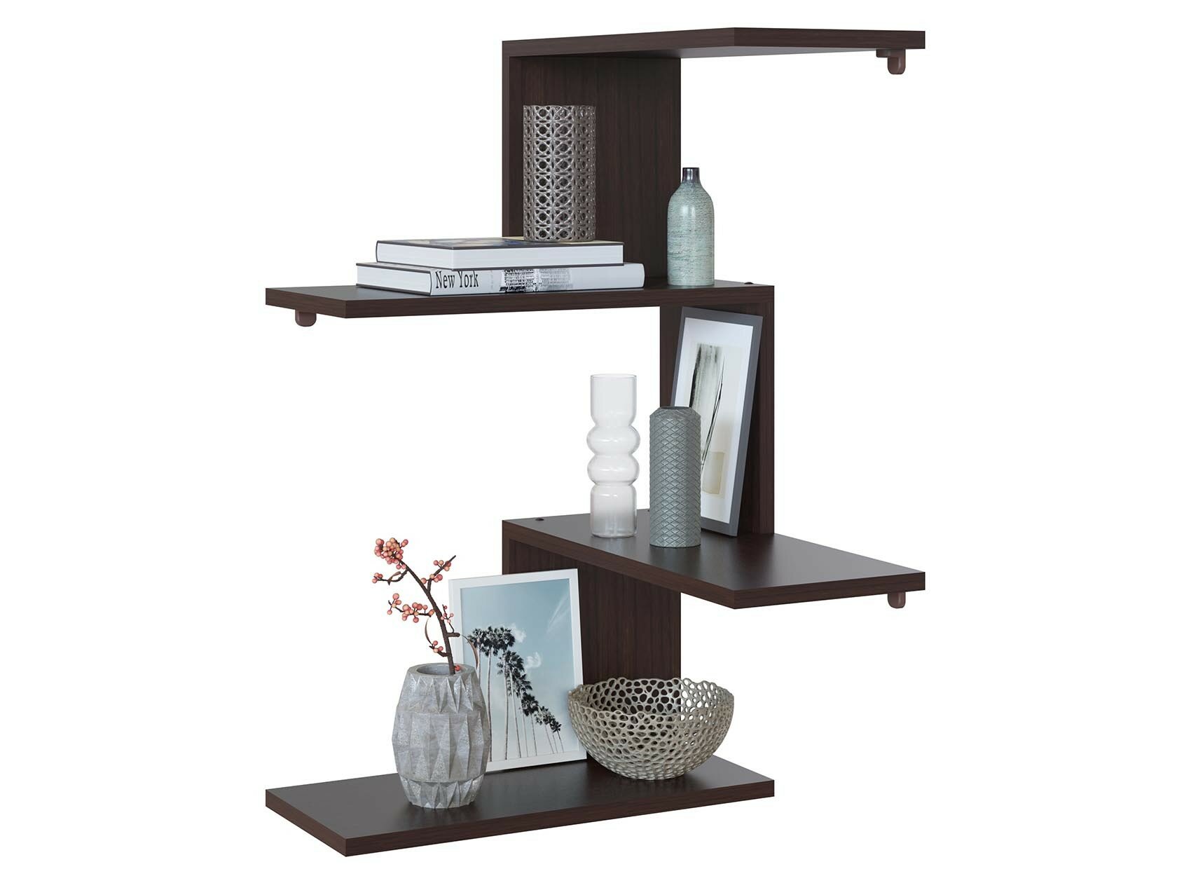 Габаритные размеры ВхШхГ 730x446x446 мм. Настенная полка ПК-7 поможет создать уютную обстановку в современном интерьере. Модель разместит сувениры, фото в рамках и другие предметы декора, визуально не загромождая пространство.