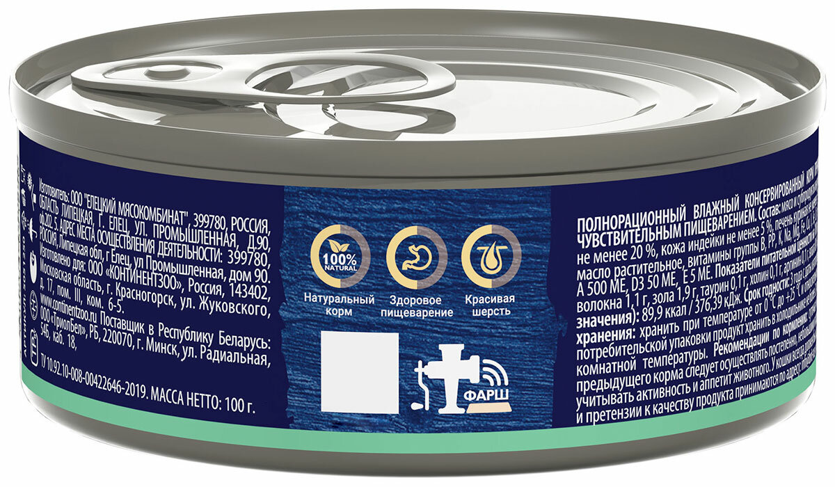 | Состав | Состав: мясо и субпродукты индейки (в т.ч. филе индейки не менее 10 %, фарш индейки не менее 20 %, кожа индейки не менее 5 %, печень куриная не менее 5 %), гидролизат куриного белка, клетчатка, рыбий жир, масло растительное, витамины группы B, РР, K, Na, Mg, Fe, Cu, I, Se, Са и Р (1 / 0,8), витамины (питательные добавки на 100 г): А 500 МЕ, D3 50 ME, Е 5 МЕ. |