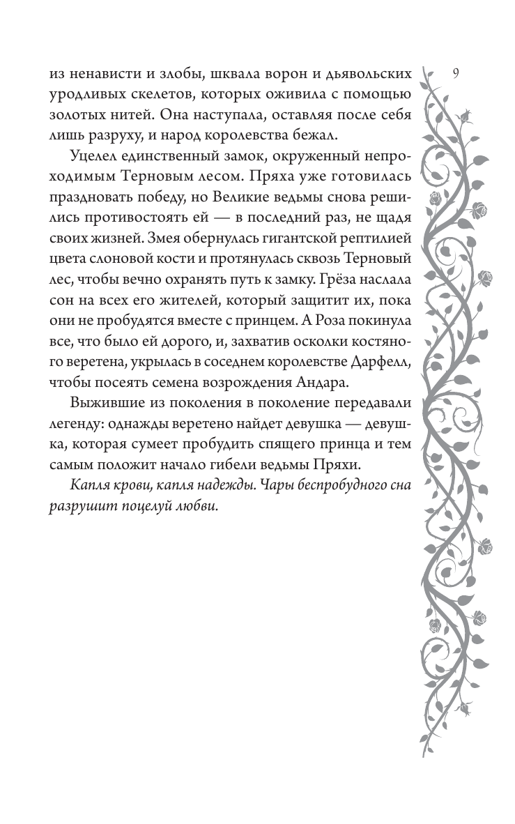 В сказке, которую мы все знаем, юная принцесса уколола палец о веретено и уснула вечным сном до тех пор, пока прекрасный принц не разбудил ее поцелуем. Лесли Веддер рассказывает другую историю, в которой проклятие столетнего сна наложено на принца, а двум отважным девушкам - искательнице сокровищ и наёмному воину - предстоит объединиться, чтобы спасти королевство.