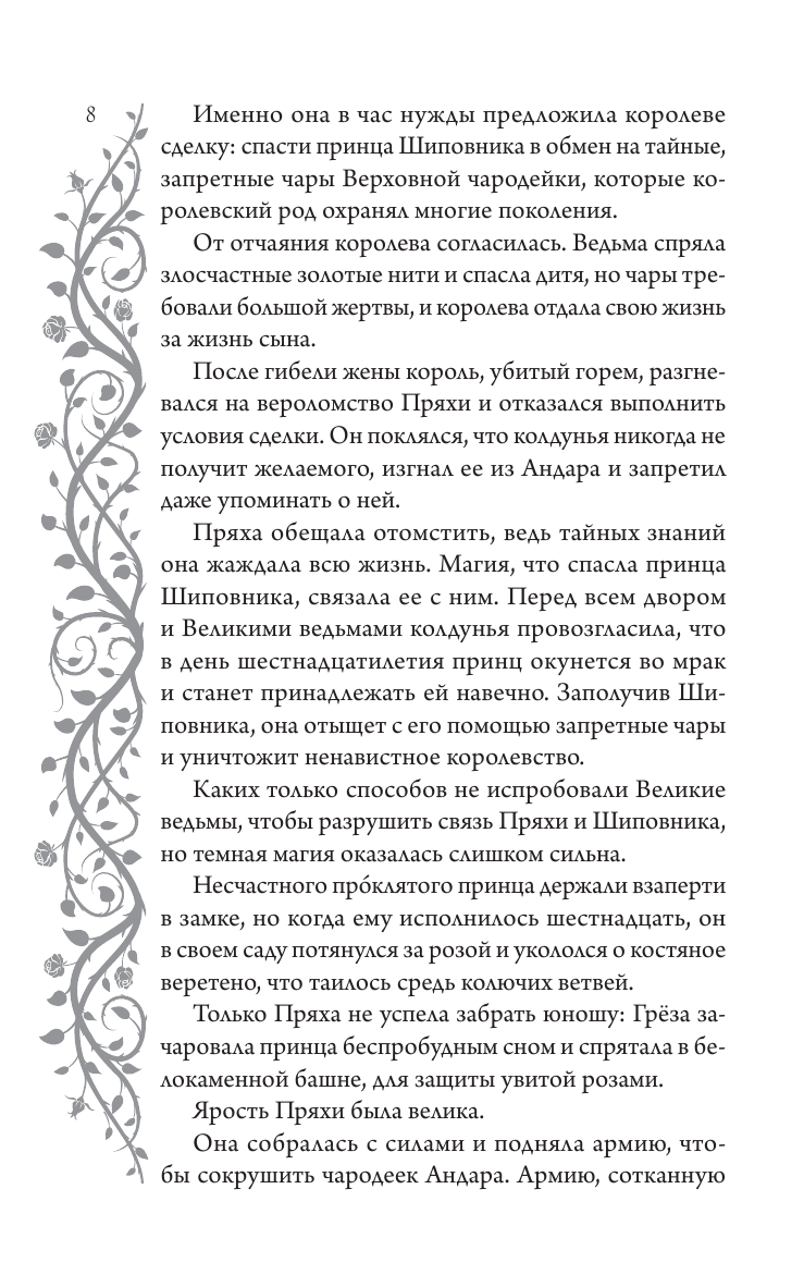 Как редактор, не смогла оторваться от книги с её начала до самого конца! Знакомый всем сюжет про спящую красавицу переворачивается с ног на голову, и вот колдовским сном в этой истории окутывается уже не принцесса, а принц. Чтобы спасти его королевство, на опасную тропу выходят кладоискательница-историк Фи и воинственная наёмница Шейн. Мы следим за их приключениями, затаив дыхание... Экшен в этой книге ничем не уступает лучшим историям про Индиану Джонса) Но неизменным остаётся одно: пробудить принца можно лишь одним способом - поцелуем. И, кажется, у одной из девушек будет возможность познакомиться с королевской особой даже раньше попадания в заколдованный замок...