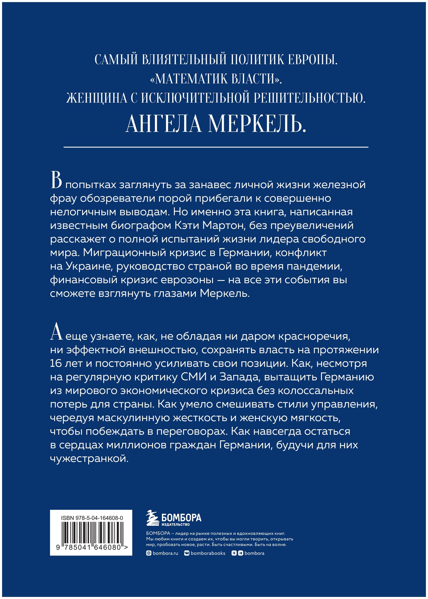 В попытках заглянуть за занавес личной жизни железной фрау обозреватели порой прибегали к совершенно нелогичным выводам. Но именно эта книга, написанная известным биографом Кэти Мартон, без преувеличений расскажет о полной испытаний жизни лидера свободного мира. Миграционный кризис в Германии, конфликт на Украине, руководство страной во время пандемии, финансовый кризис еврозоны –– на все эти события вы сможете взглянуть глазами Меркель.