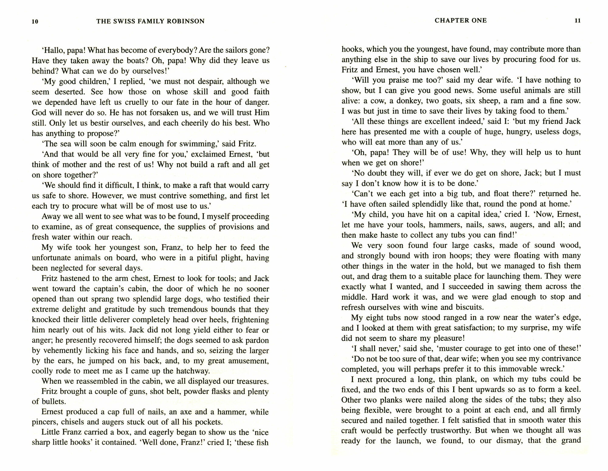 Сильная буря в море, кораблекрушение, единственные выжившие - члены одной семьи, оказавшиеся на пустынном острове. Это основная идея приключений в "Швейцарской семье Робинзонов" Криса Тэйта. Легкое и быстрое чтение, автор придумал различные испытания, с которыми семья должна справиться: постройка убежища, поиск пищи и умение ладить друг с другом, конечно же. Без сюрпризов не обойдется!