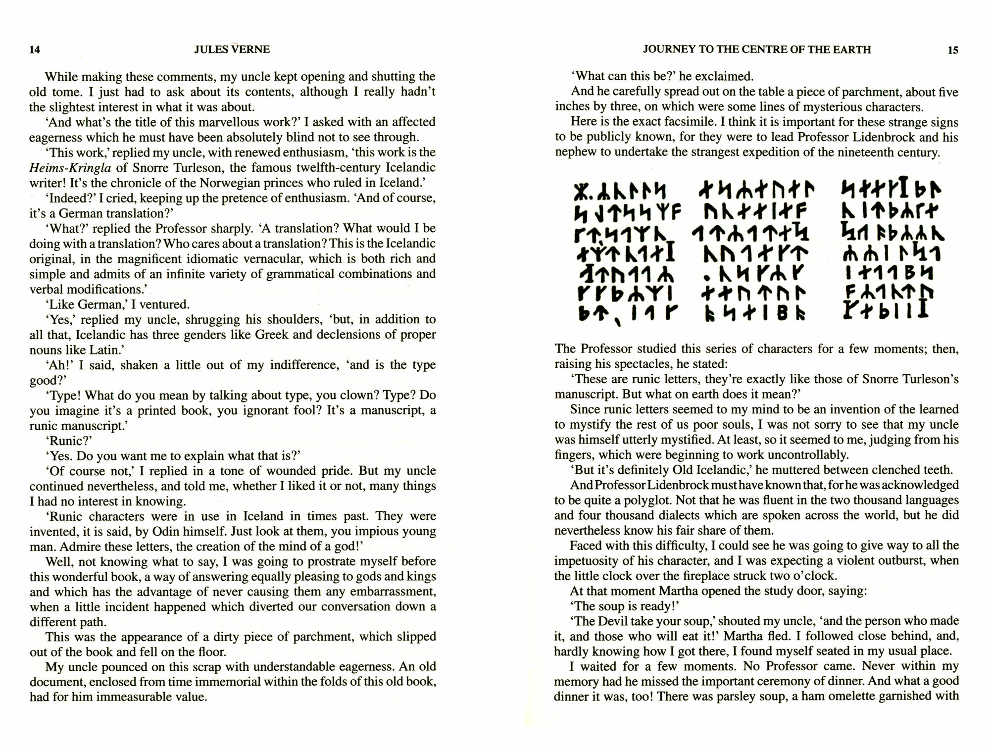 Professor Otto Lidenbrock's great adventure begins by chance when a scrap of paper drops out of an ancient book he has just bought. The coded inscription reveals the existence of a passageway leading to the Centre of the earth and that the entrance lies within the crater of an extinct volcano in Iceland.