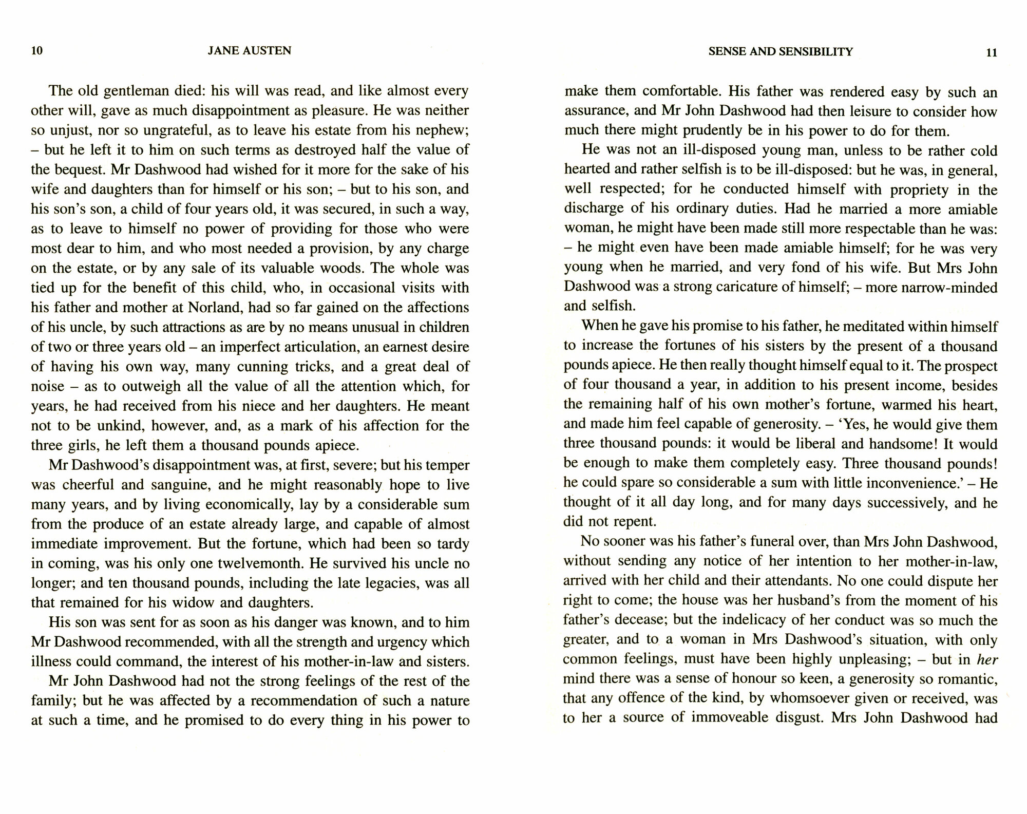 Elinor is as prudent as her sister Marianne is impetuous. Each must learn from the other after they are forced by their father's death to leave their home and enter into the contests of polite society. The charms of unsuitable men and the schemes of rival ladies mean that their paths to success will be beset with disappointment.