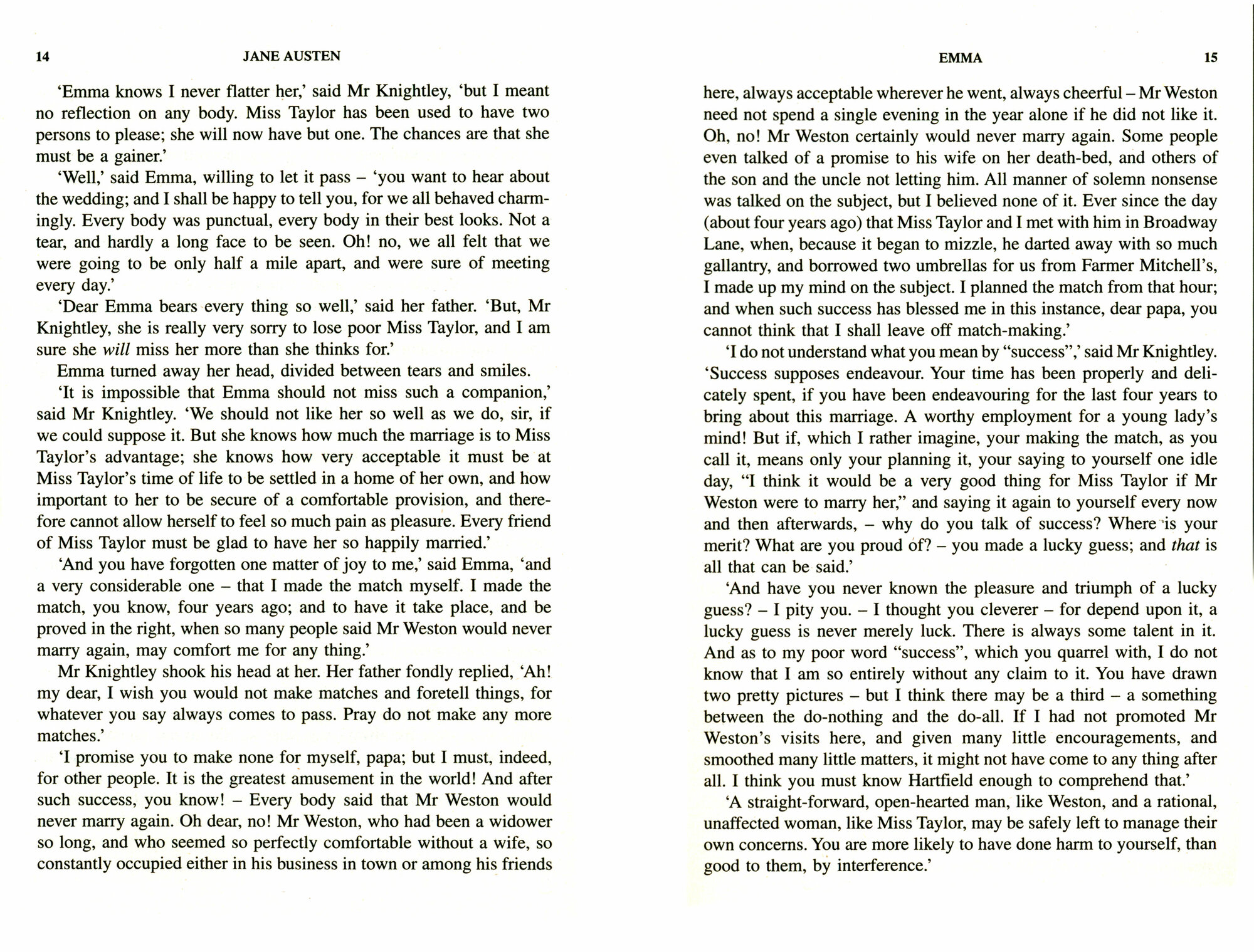 Боже мой, как же я обожаю эту книгу! В какой-то момент, ближе к концу, когда произошло нечто совершенно особенное, это было невероятно, моя душа запела. Сама Эмма - уникальное создание, упрямая, заблудшая, уверенная в себе девушка, которую мы не можем не любить, потому что она честна. Любовные приключения неисчислимы, юмор превосходен, а стиль автора воистину впечатляет. Было интересно прочитать это вместе с "ИДИОТОМ" Достоевского, потому что у них много общего, и потому что здесь столько же правды и проницательности, сколько и различных дополнительных удовольствий. Остин обычно недооценивают по всяким смехотворным причинам, а также потому, что адаптации ее работ демонстрируют ее умение работать с сюжетом больше, чем с языком. Хочется читать ее быстро и, в то же время, смаковать каждую страницу. Это невероятная книга! Потрясающая и невероятная!