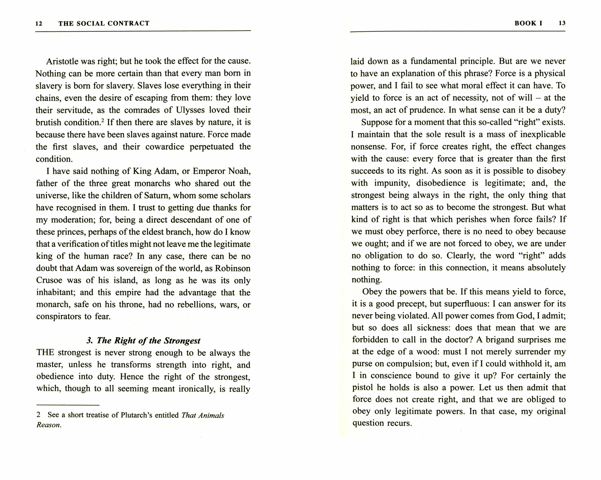 Общественный договор, наряду с «Рассуждениями» Руссо о происхождении неравенства, является одним из классических произведений политической и социальной мысли. Я рад, что наконец-то прочитал его. Руссо намеревается ответить на вопрос о том, может ли существовать законное правительство, и каким условиям оно должно соответствовать. Руссо отвергает точку зрения Гоббса о том, что политическая власть может быть сосредоточена в одном человеке, но у него схожее с Гоббсом мнение о природе суверенной власти. Он утверждает, что при законном правительстве люди так же свободны, как и в «естественном состоянии». Руссо предполагает, что прямая демократия (по образцу древних Афин) лучше, чем представительная демократия, хотя он также говорит, что не все общества, возможно, даже не большинство, способны иметь прямую демократию. Он пишет в Книге II, глава III, что было бы лучше, если бы избиратели «не общались друг с другом» во время голосования, что является ранним примером предложения о тайном голосовании. Это вполне самостоятельная и цельная книга, но если она вам нравится, я также рекомендую прочесть маленькое эссе «Федералист № 10» Мэдисона, где обсуждаются те же проблемы, чтобы получить полную картину.