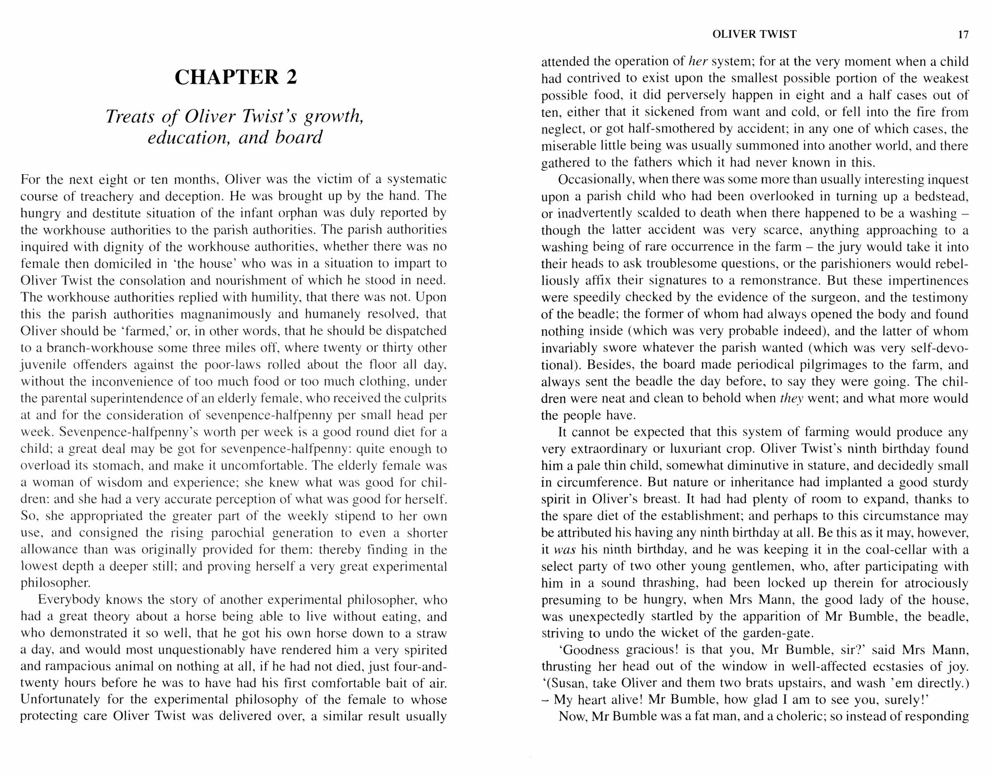 A parade of memorable characters drives the author's message home: Mr Bumble, the workhouse beadle; Fagin, who runs a den of child thieves; Oliver's streetwise friend, the Artful Dodger; Nancy, the prostitute; and her lover, brutal Bill Sikes.