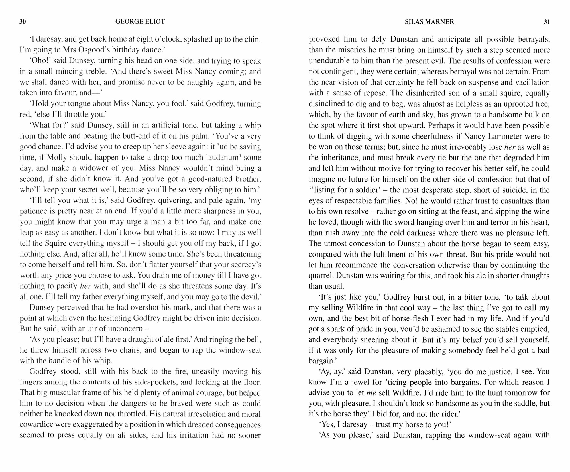 Silas Marner (1861) is Eliot's classic tale of an outsider. A weaver who comes to live and work alone in the Midlands village of Raveloe, Silas Marner's sole pleasure is to count his growing hoard of gold. When it is stolen, his life ceases to have meaning - until Eppie wanders into the weaver's cottage one snowy New Year's Eve and falls asleep on his hearth. Eppie is two years old.