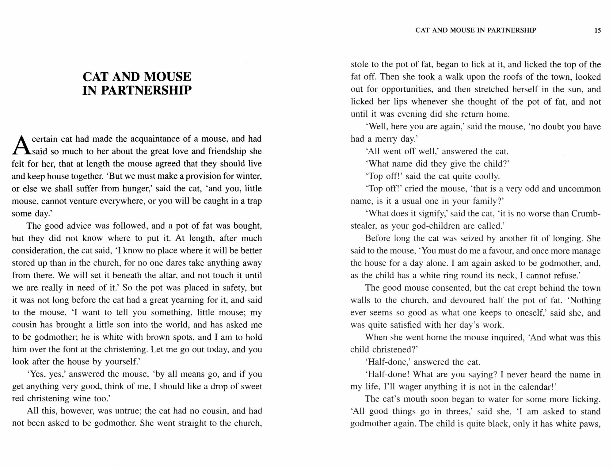 This selection contains forty-five stories and includes some of the best known, such as 'Briar- Rose' (perhaps better known as 'Sleeping Beauty'), and 'Little Red-Cap' ('Little Red Riding Hood'), as well as some of the lesser known tales, like 'The Mouse, the Bird and the Sausage', 'The Iron Stove' and 'The Hare and the Hedgehog'.