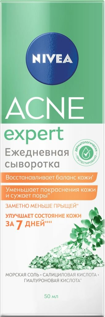 Ежедневная сыворотка ACNE EXPERT от NIVEA помогает восстановить баланс кожи, работая в 5 направлениях: 1. Уменьшает до 99% бактерий вызывает акне* 2. Контролирует выделение кожного жира 3. Сужает поры*** 4. Помогает уменьшить несовершенства 5. Мгновенно впитывается кожей и матирует. Доказанный эффект*** благодаря формуле с активными ингредиентами: МОРСКАЯ СОЛЬ + САЛИЦИЛОВАЯ КИСЛОТА + ГИАЛУРОНОВАЯ КИСЛОТА** + КАРНИТИН + ЭКСТРАКТ КОРНЯ СОЛОДКИ. Результат - заметно меньше прыщей*** и улучшает состояние кожи за 7 дней****! Без SLS и парабенов. Способ применения: ежедневно наносите на очищенную кожу лица, избегая области вокруг глаз. Используйте 2 раза в день.