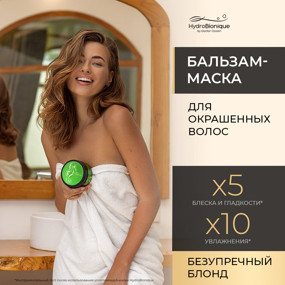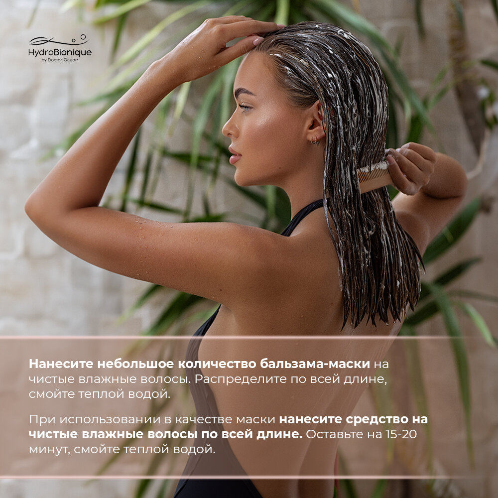 Бальзам-маска рекомендуется к использованию обладательницам окрашенных, обезвоженных и сухих волос. Комплексное воздействие двух ингредиентов позволяет насытить волосы влагой, убрать “пушистость” и придать здоровый блеск.Абиссинское масло содержит уникальный комплекс ненасыщенных жирных кислот, в который входят пальмитиновая, стеариновая, линолевая, линоленовая, олеиновая, эйкозапентаеновая и арахидоновая кислоты в пропорциях, необходимых для моментального увлажнения и питания стержня волоса. Абиссинское масло, или крамбе, отличается высоким индексом проницаемости, но при этом не утяжеляет волосы и не создает ощущения жирности. Масло создает на поверхности волоса невидимую пленку, защищая волосы от воздействия негативных внешних факторов и солнечных лучей. Абиссинское масло стабильно при высоких температурах, поэтому бальзам-маска прекрасно защищает волосы при использовании фена и других средств укладки, связанных с воздействием высоких температур.Морская ромашка растет в прибрежных дюнах в почве с высоким недостатком влаги и питательных элементов. Поэтому морская ромашка обладает высокой резистентностью к агрессивным внешним факторам и способна удерживать влагу, необходимую для выживания. В составе бальзама-маски морская ромашка обеспечивает сохранение пигмента в окрашенных волосах и предохраняет от появления “желтизны”.HydroBionique - море роскоши и океан удовольствия в новой коллекции средств по уходу за лицом, телом и волосами от производителя морских витаминов Доктор Море!Удивляйте роскошными волосами, пленяйте стройной фигурой, соблазняйте потрясающей кожей - будьте собой! Будьте с HydroBionique!