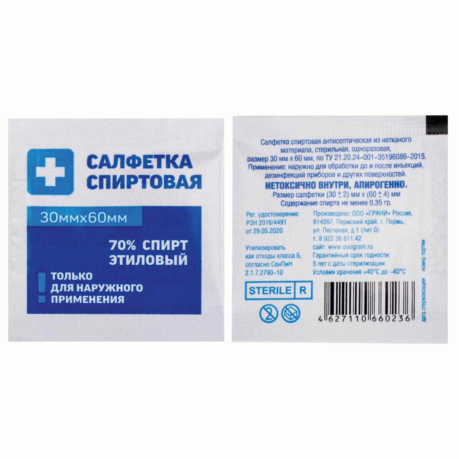 Состав нетканая основа - полотно нетканое гидросплетенное Спанлейс поверхностной плотности не менее 40 г./кВ. м; пропиточный раствор - раствор этилового спирта для наружного применения и приготовления лекарственных форм 70%.Описание Салфетка спиртовая антисептическая из нетканого материала, стерильная, одноразовая размером (30±2)мм х (60±4)мм. Салфетки спиртовые представляют собой медицинское изделие, содержащее носитель, пропитанный спиртосодержащим лекарственным средством и помещенное в герметичную упаковку. В качестве носителя используют полотно нетканое гидросплетенное Спанлейс поверхностной плотности не менее 40 г./кВ. м по ТУ 8392-001-55365591-2009 В качестве пропитывающего средства используется этиловый спирт, раствор для наружного применения и приготовления лекарственных форм 70%. Рег. № ЛСР -009481/09 от 21.05.2009 г В салфетке содержится не менее 0,35 г раствора спирта. Салфетка упакована в индивидуальную упаковку изготовленную из материала упаковочного комбинированного на бумажной основе по ТУ 5453-001-81659324-2010, производства ООО «Орбита-Ф». Вскрытие индивидуальной упаковки - герметичного пакета не требует ножниц. Салфетка должна быть стерильной после стерилизации радиационным методом Прочность термосваренной упаковки на разрыв должна быть не менее 10 Н Салфетка спиртовая предназначена для наружного применения в качестве антисептического и дезинфицирующего средства для обработки неповрежденной кожи, поврежденной или подверженной опасности повреждения кожной поверхности (кожа, кожно-локтевые сгибы до и после инъекции), операционного поля, а также для обработки медицинских изделий (в том числе медицинских инструментов), деталей медицинской техники. Салфетка рекомендуется для применения в клиниках, амбулаториях, условиях работы бригад скорой помощи, для оказания первой помощи на транспорте, на производстве, в офисах, в домашних условиях.Показания обработка неповрежденной кожи, поврежденной или подверженной опасности повреждения кожной поверхности (кожа, кожно-локтевые сгибы до и после инъекции), операционного поля, а также для обработки медицинских изделий (в том числе медицинских инструментов), деталей медицинской техники.Противопоказания индивидуальная непереносимость этилового спирта. Не обрабатывать салфеткой слизистые оболочки.Способ применения и дозы Вручную вскрыть пакет, достать изделие, развернуть. порядок применения изделия Обработка кожи, например инъекционного поля: тщательно протереть салфеткой спиртовой кожу инъекционного поля. Время выдержки - до полного высыхания или по указанию медицинского персонала. Обработка локтевых сгибов доноров: тщательно протереть кожу локтевых сгибов двухкратно, используя раздельные салфетки спиртовые. Время выдержки - до полного высыхания или по указанию медицинского персонала. Обработка поверхностей: вручную вскрыть пакет, достать изделие, развернуть, тщательно протереть салфеткой.
