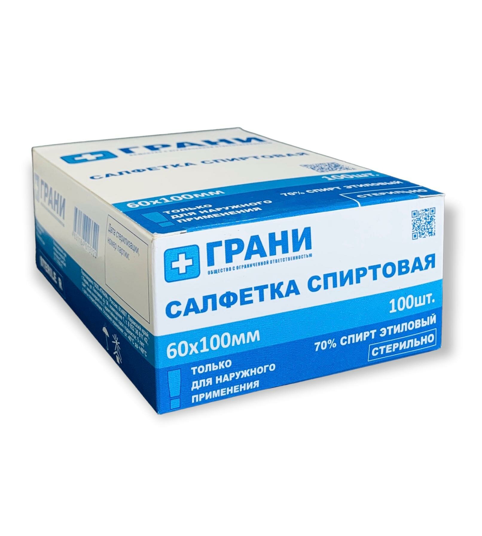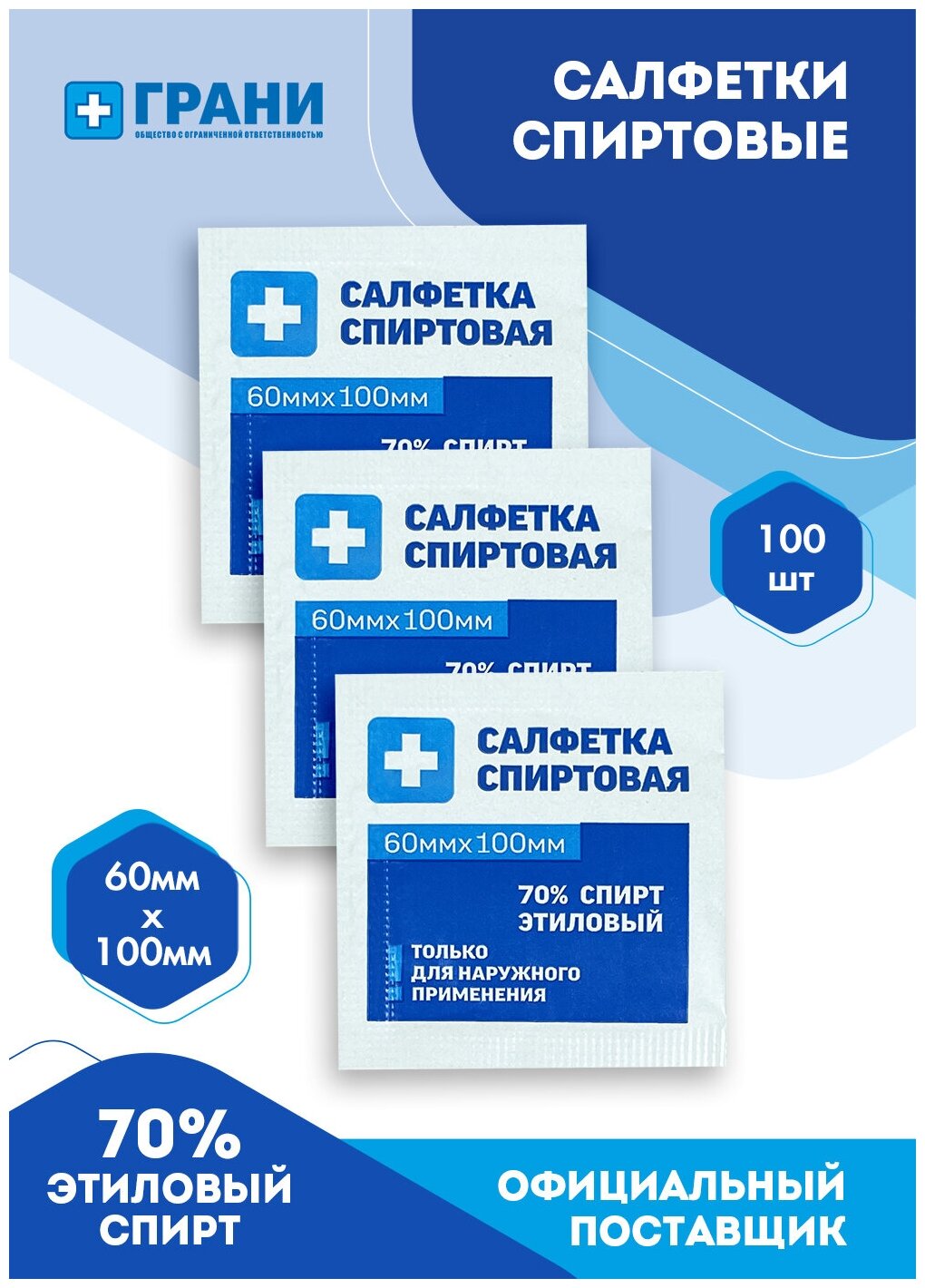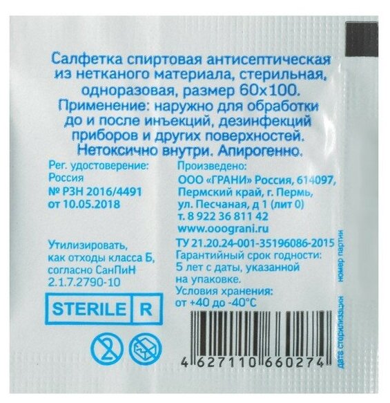 Салфетки спиртовые антисептические из нетканого материала стерильная одноразовая 60х100мм 50шт ООО Грани (2239674)