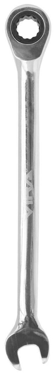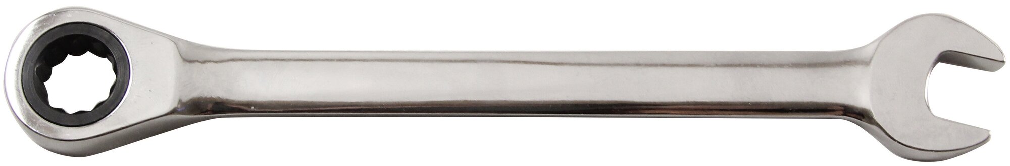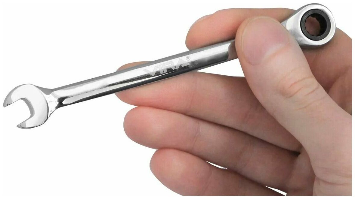 Оснащен трещоткой, что позволяет вам работать с креплением, не снимая инструмент с гайки после каждого рабочего движения. Ключ отводится назад механизмом обратного движения трещотки. Храповой механизм и все зубья - металлические. Минимальный угол поворота механизма - 5 градусов: такая точность позволяет хорошо контролировать рабочий процесс. Поверхность ключа зеркально отполирована. Помимо антикоррозийного эффекта, полировка привлекает к ключу внимание, когда он лежит среди прочих инструментов.