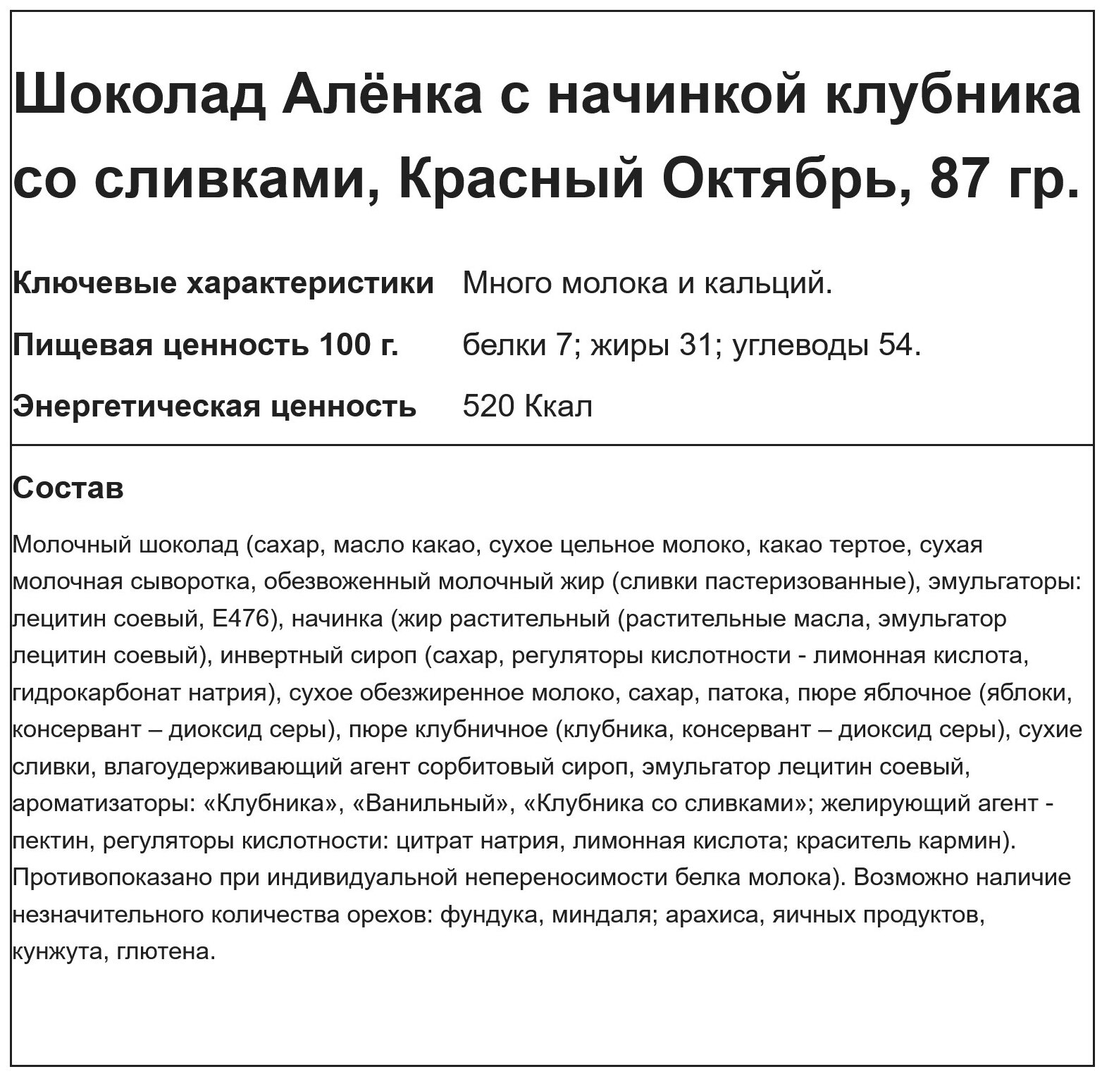 Состав: Молочный шоколад сахар, масло какао, сухое цельное молоко, какао тертое, сухая молочная сыворотка, обезвоженный молочный жир сливки пастеризованные, эмульгаторы: лецитин соевый, E476, начинка жир растительный растительные масла, эмульгатор лецитин соевый, инвертный сироп сахар, регуляторы кислотности - лимонная кислота, гидрокарбонат натрия, сухое обезжиренное молоко, сахар, патока, пюре яблочное яблоки, консервант – диоксид серы, пюре клубничное клубника, консервант – диоксид серы, сухие сливки, влагоудерживающий агент сорбитовый сироп, эмульгатор лецитин соевый, ароматизаторы: Клубника, Ванильный, Клубника со сливками; желирующий агент - пектин, регуляторы кислотности: цитрат натрия, лимонная кислота; краситель кармин. Противопоказано при индивидуальной непереносимости белка молока. Возможно наличие незначительного количества орехов: фундука, миндаля; арахиса, яичных продуктов, кунжута, глютена.