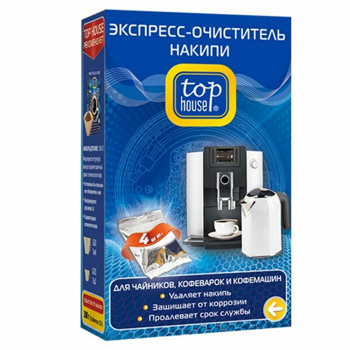 TOP HOUSE Экспресс-очиститель накипи для чайников, кофеварок и кофемашин, 4 шт. х 50 г. Удаляет накипь. Предотвращает образование коррозии в процессе использования. Разработан на основе органических безопасных компонентов. Не содержит агрессивных кислот и токсичных компонентов. Бережно относится к внутренним деталям приборов. Продлевает срок службы. Сокращает расход электроэнергии.