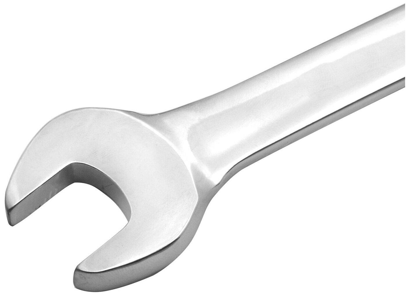 Оснащен трещоткой, что позволяет вам работать с креплением, не снимая инструмент с гайки после каждого рабочего движения. Ключ отводится назад механизмом обратного движения трещотки. Храповой механизм и все зубья - металлические. Минимальный угол поворота механизма - 5 градусов: такая точность позволяет хорошо контролировать рабочий процесс. Поверхность ключа зеркально отполирована. Помимо антикоррозийного эффекта, полировка привлекает к ключу внимание, когда он лежит среди прочих инструментов. Изделие имеет овальное сечение, поэтому меньше натирает ладонь и пальцы во время работы.