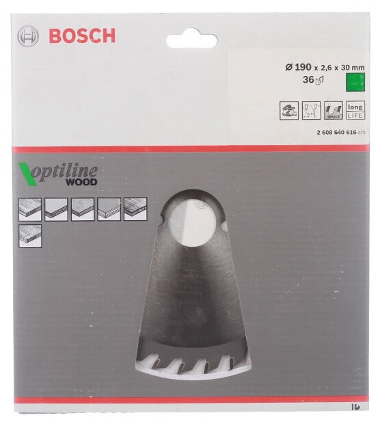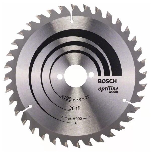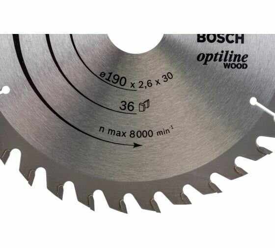 | Особенности | Для всех видов древесины. Внешний диаметр 190 мм. Посадочное отверстие 30 мм. Число зубьев - 36. |