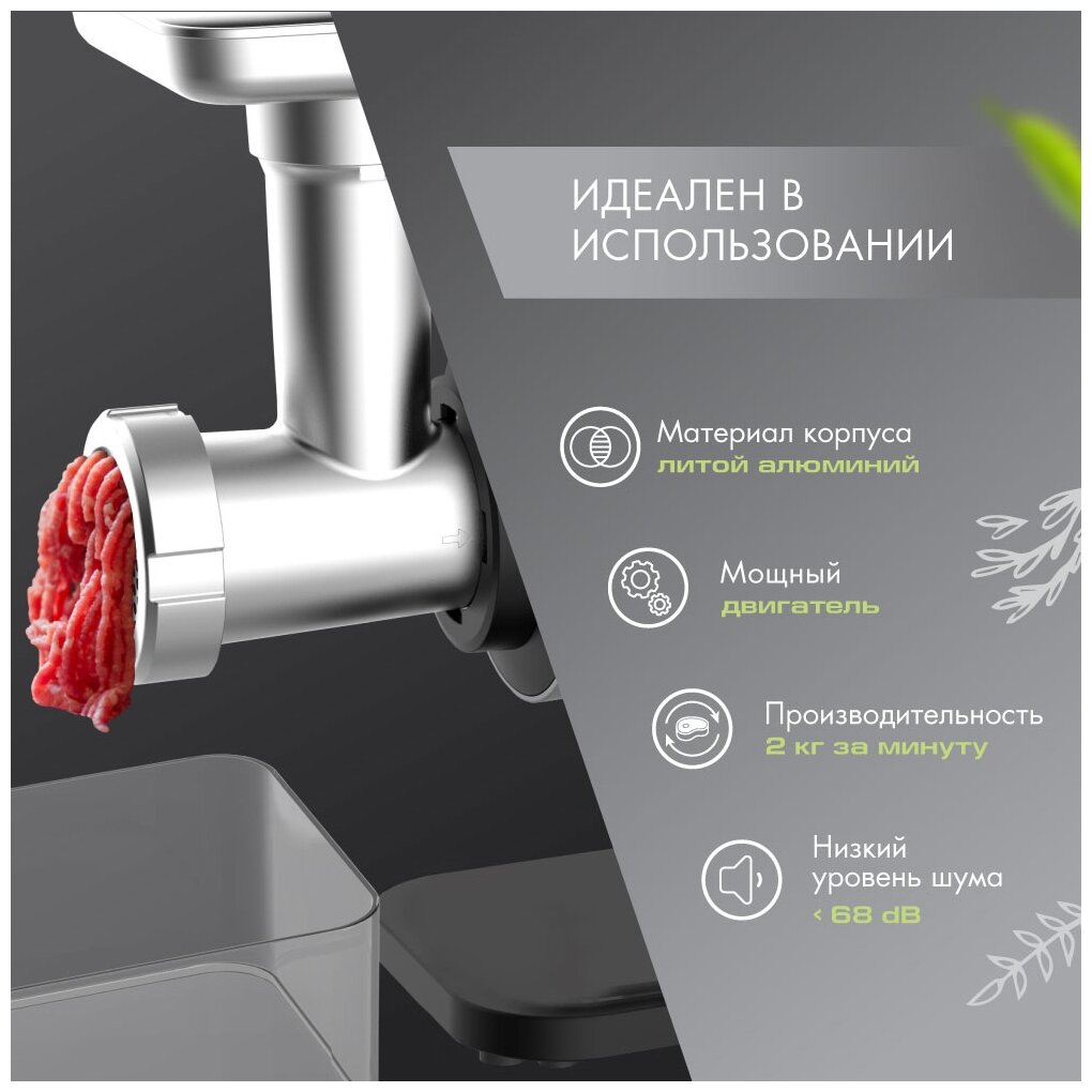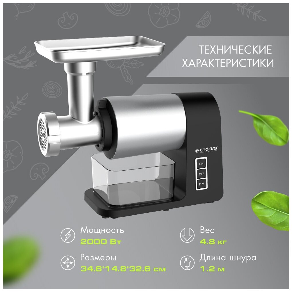 Электрическая мясорубка ENDEVER оснащена DC двигателем, который работает с мощностью 2000 Вт, обеспечивает плавный старт работы и с легкостью перерабатывает даже очень плотное мясо. Благодаря широкой насадке, достигается потрясающий результат, эта модель измельчает 2 кг мяса в минуту.