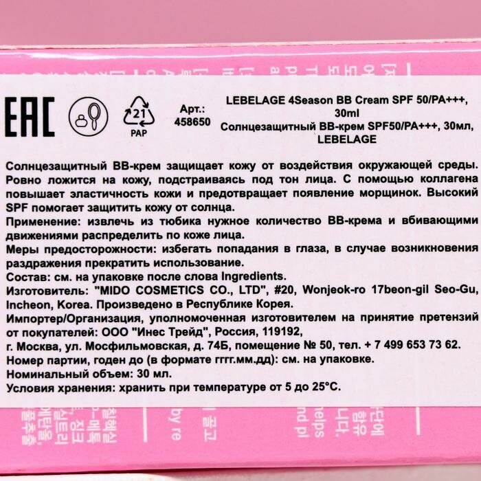 Сервис сравнения цен СкидкаГИД предлагает сравнить цены на товар «ВВ-крем Lebelage 4Season BB Cream SPF 50 30мл (458650)»