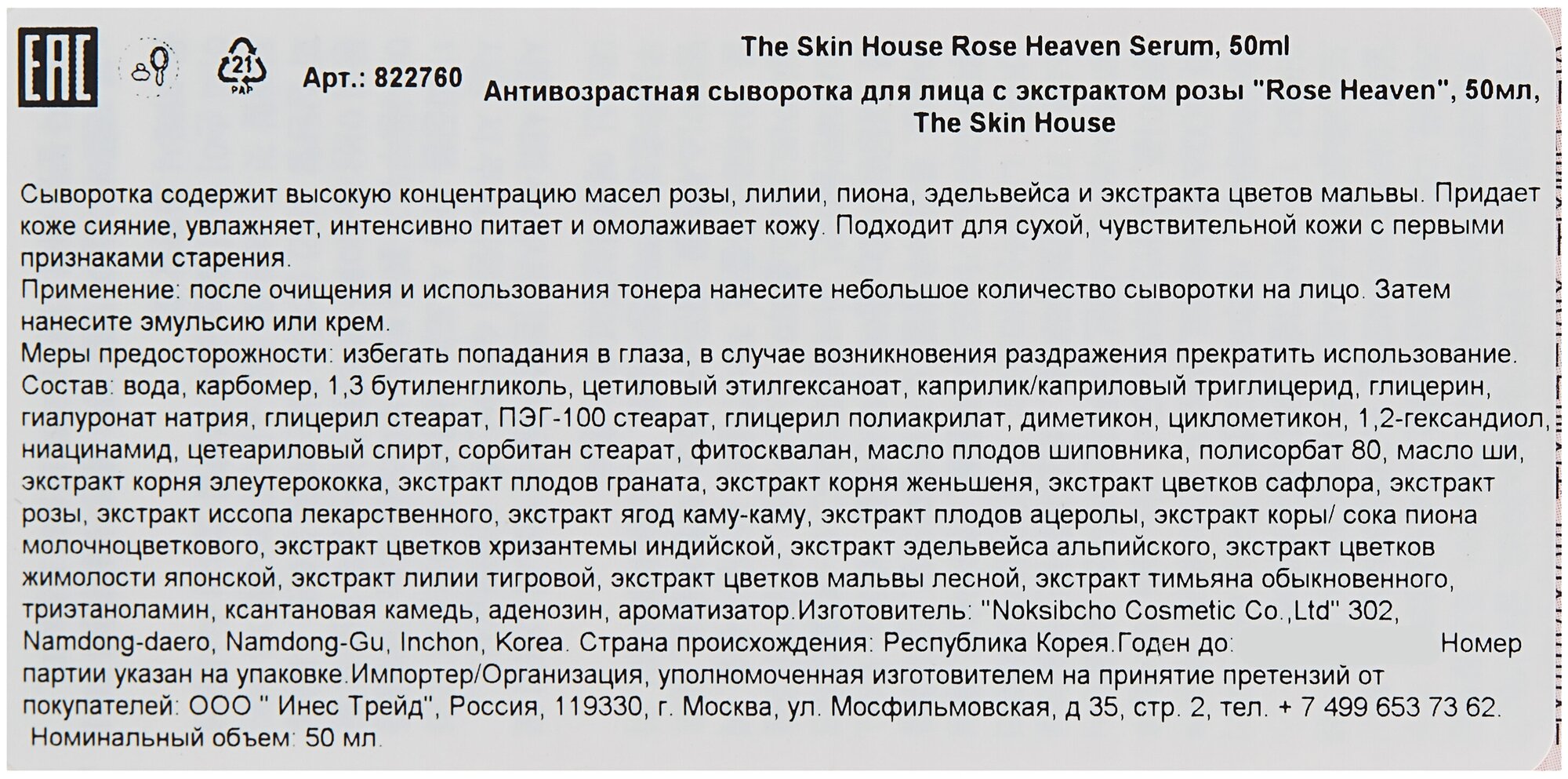 На сегодняшний день товар «Антивозрастная сыворотка для лица с экстрактом розы The Skin House Rose Heaven Serum 50мл (СКХ 103)» можно купить с кешбеком в 1 магазине: Яндекс.Маркет