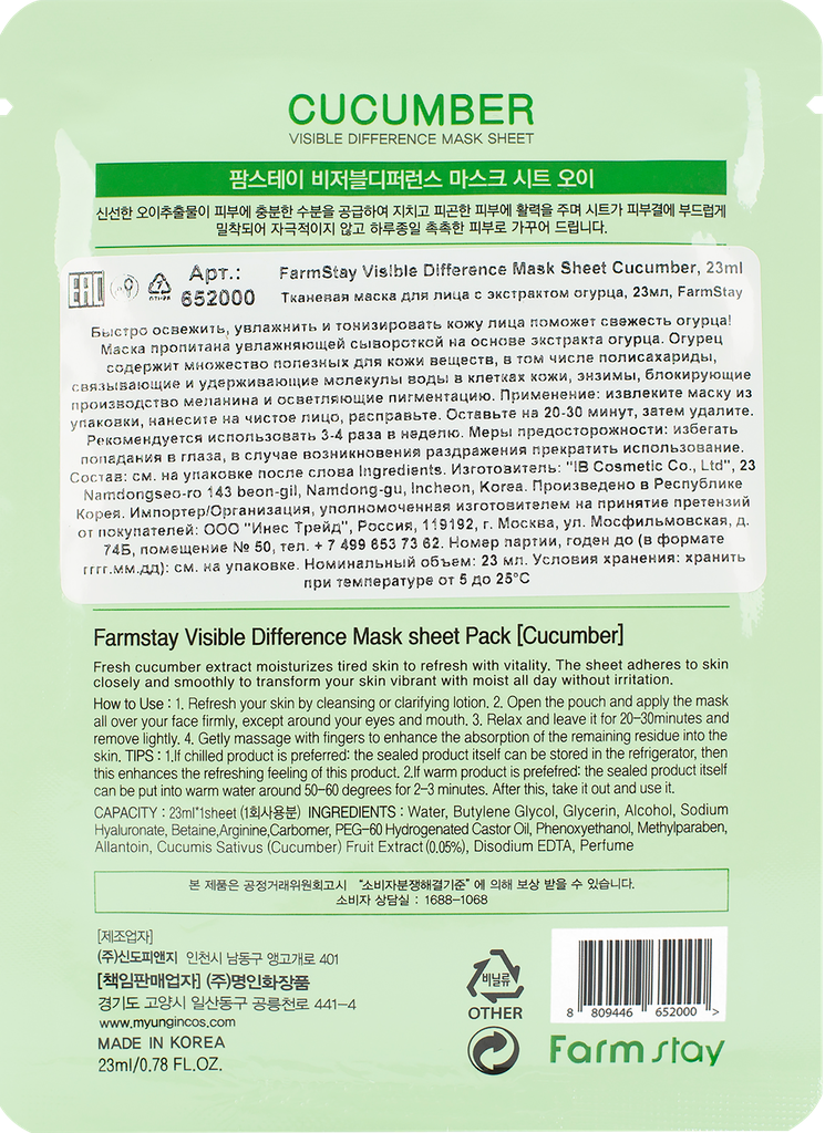 На сегодняшний день товар «Тканевая маска для лица с экстрактом огурца FarmStay Visible Difference Mask Sheet Cucumber 23мл (7287966)» можно купить с кешбеком в 1 магазине: Яндекс.Маркет