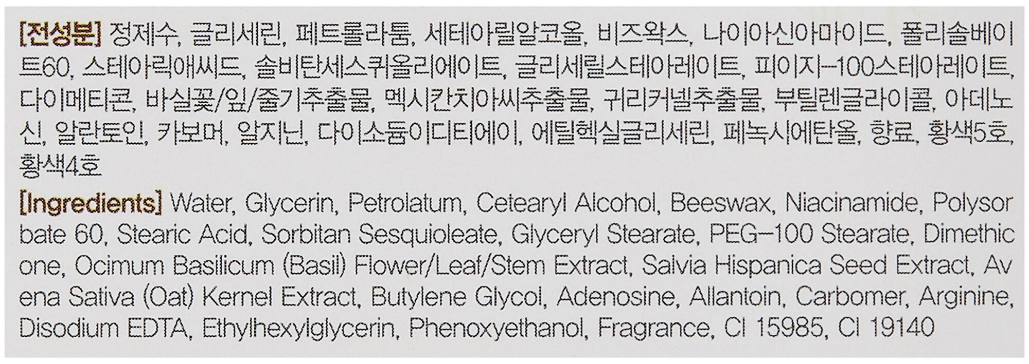 | Состав | Water, Glycerin, Petrolatum, Cetearyl Alcohol, Beeswax, Niacinamide, Polysorbate 60, Stearic Acid, Sorbitan Sesquioleate, Glyceryl Stearate, PEG-100 Stearate, Dimethicone, Ocimum Basilicum (Basil) Flower/Leaf/Stem Extract, Salvia Hispanica Seed Extract |