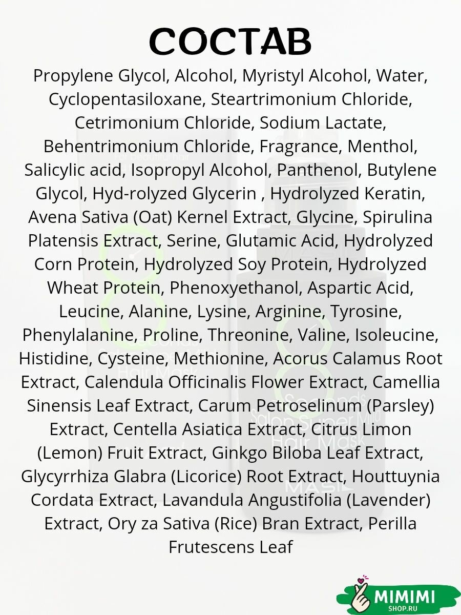 | Состав | Dipropylene Glycol, Myristyl Alcohol, Water, 1,2-Hexanediol, Hamamelis Virginiana (Witch Hazel) Leaf Extract, Salvia Officinalis (Sage) Leaf Extract, Melissa Officinalis Leaf Extract, Mentha Piperita (Peppermint) Extract, Lavandula Angustifolia (Lavender) Flower Extract, Houttuynia Cordata Extract, Eucalyptus Globulus Leaf Extract, Cetrimonium Chloride, Arginine, Leucine, Tryptophan, Lysine, Isoleucine, Threonine, Methionine, Histidine, Asparagine, Alanine, Proline, Glutamic Acid, Glutamine, Glycine, Valine, Phenylalanine, Aspartic Acid, Tyrosine, Serine, Cystine, Glycerin, Hydrolyzed Barley Protein, Hydrolyzed Corn Protein, Hydrolyzed Potato Protein, Hydrolyzed Rice Protein, Hydrolyzed Rice Bran Protein, Hydrolyzed Soy Protein, Hydrolyzed Oat Protein, Hydrolyzed Pea Protein, Hydrolyzed Wheat Protein, Hydrolyzed Sweet Almond Protein, C13-15 Alkane, Fragrance |