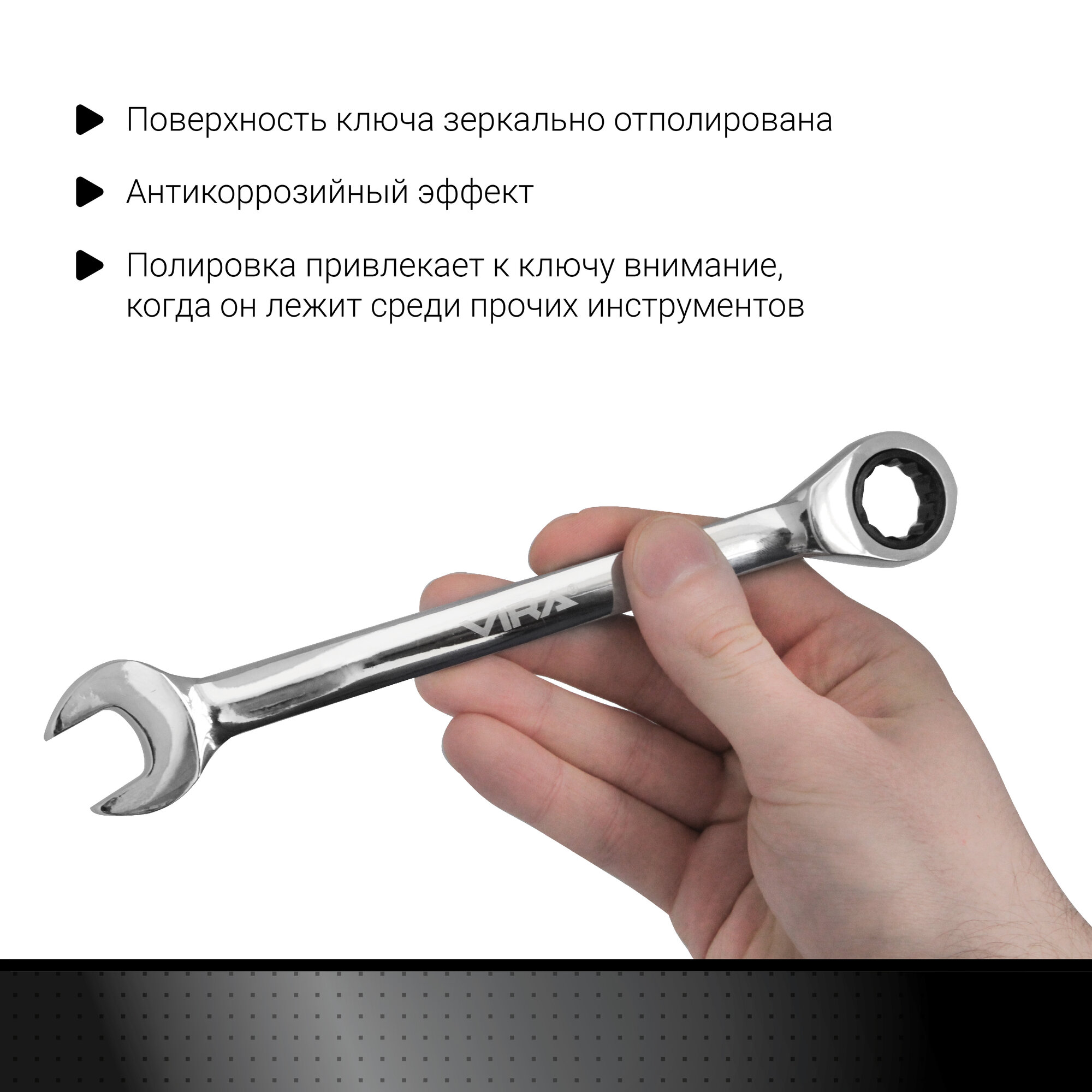 Оснащен трещоткой, что позволяет вам работать с креплением, не снимая инструмент с гайки после каждого рабочего движения. Ключ отводится назад механизмом обратного движения трещотки. Храповой механизм и все зубья - металлические. Минимальный угол поворота механизма - 5 градусов: такая точность позволяет хорошо контролировать рабочий процесс. Поверхность ключа зеркально отполирована. Помимо антикоррозийного эффекта, полировка привлекает к ключу внимание, когда он лежит среди прочих инструментов. Инструмент имеет овальное сечение, поэтому меньше натирает ладонь и пальцы во время работы.