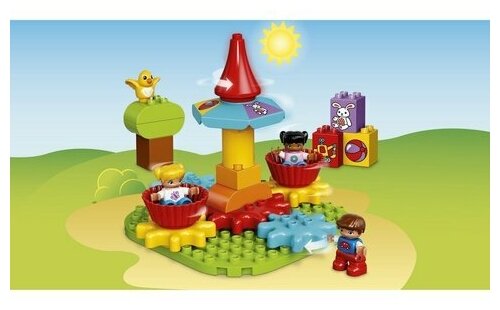 LEGO DUPLO 10845 Моя первая карусель - набор, который сможет заинтересовать вашего малыша. Маленький исследователь только начинает познавать новый для него мир, поэтому его ждет множество интересных открытий. Наверняка его взгляд остановится на интересных по форме детальках, которые складываясь друг с другом, образуют карусельку. Любопытный кроха непременно догадается повернуть верхушку карусели, а затем увидит, как приходят в движение сиденья на шестеренках. В них с удовольствием прокатятся его новые друзья: две веселых девочки и мальчик. В легкой игровой форме малыш познакомится с основными принципами формирования причинно-следственных связей, а яркое красочное оформление поможет ему сформировать свое цветовое восприятие. Lego DUPLO сделает детство вашего ребенка насыщенным и ярким!