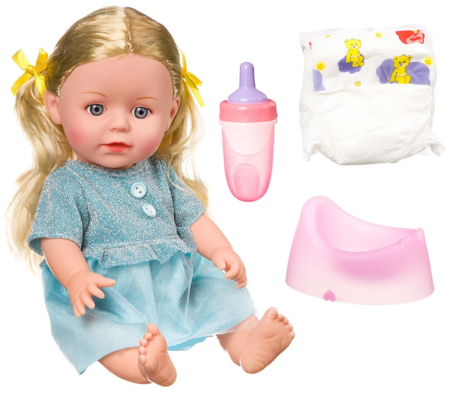 В комплекте с пупсом Вы найдете бутылочку для кормления, горшочек и памперс.
