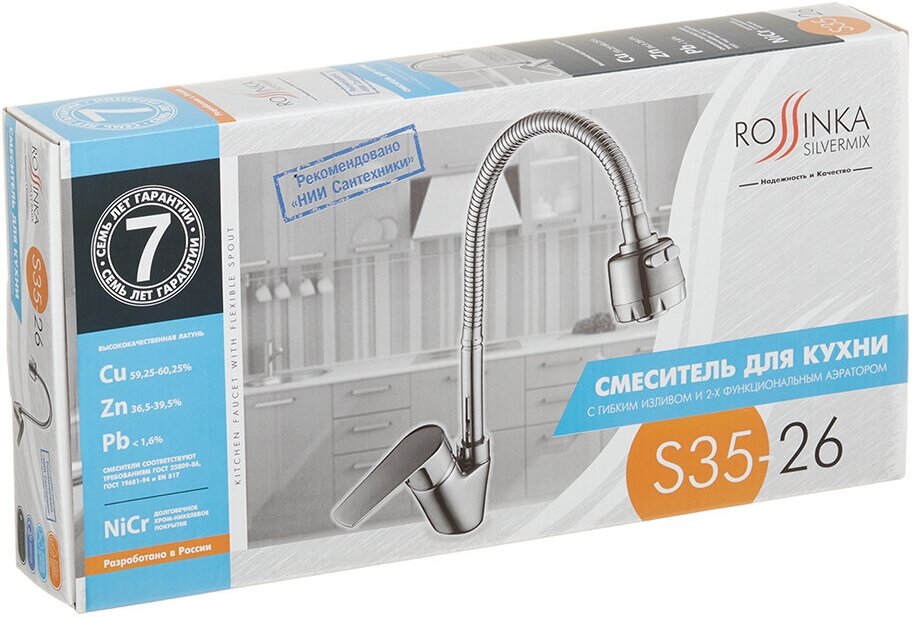 Rossinka S35-26 - смеситель из коллекции S, который идеально подойдет для раковины на кухне. Модель оснащена керамическим картриджем 35 мм. Смесители Rossinka безопасны для потребителя и окружающей среды. Корпус смесителя Rossinka изготавливается методом литья из высококачественной промышленной латуни. Качественные, надежные и доступные смесители Rossinka разработаны ведущими российскими дизайнерами с учетом условий эксплуатации и органично вписываются в стандартное планировочное решение типовых ванных комнат и кухонь.