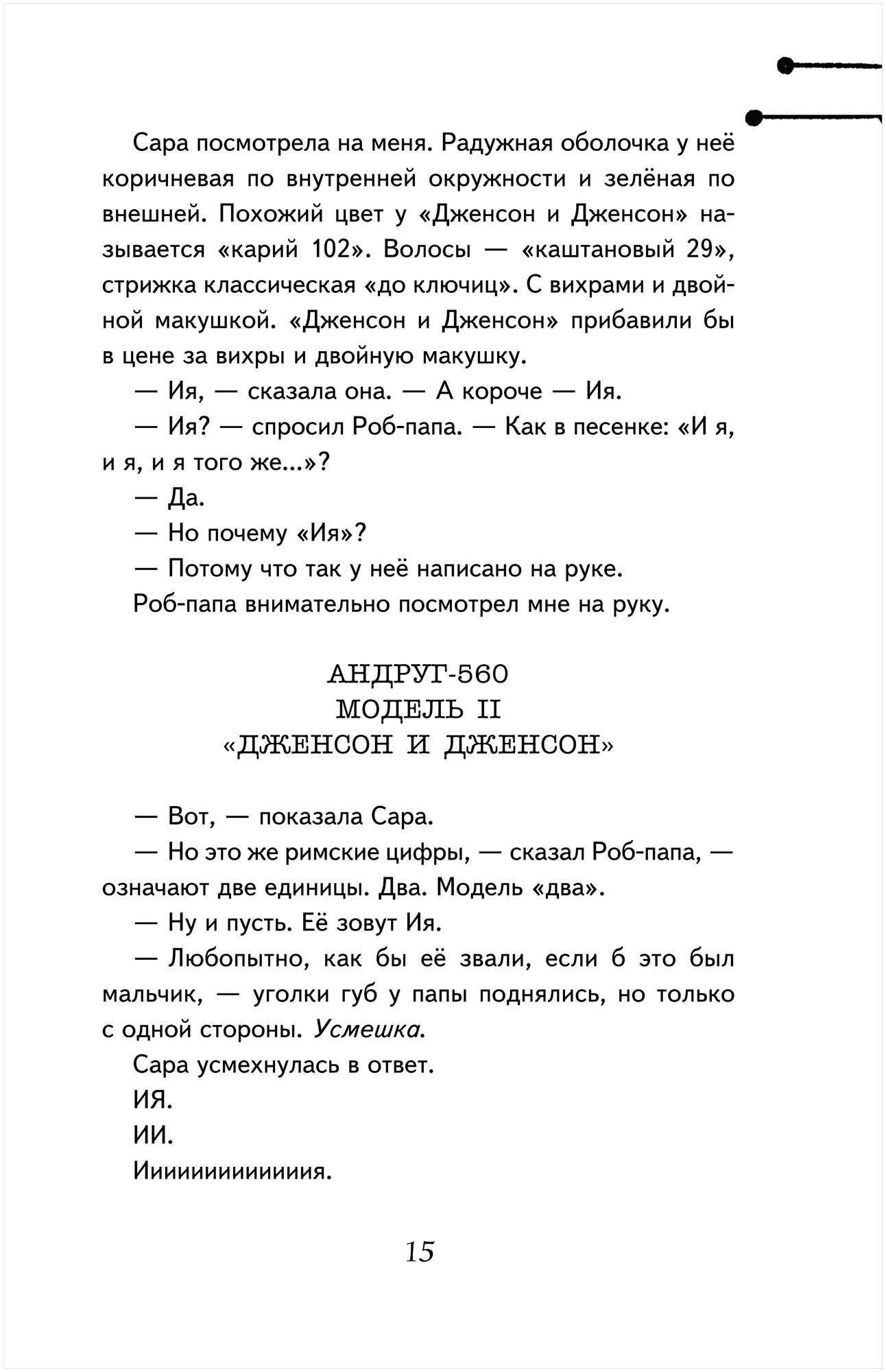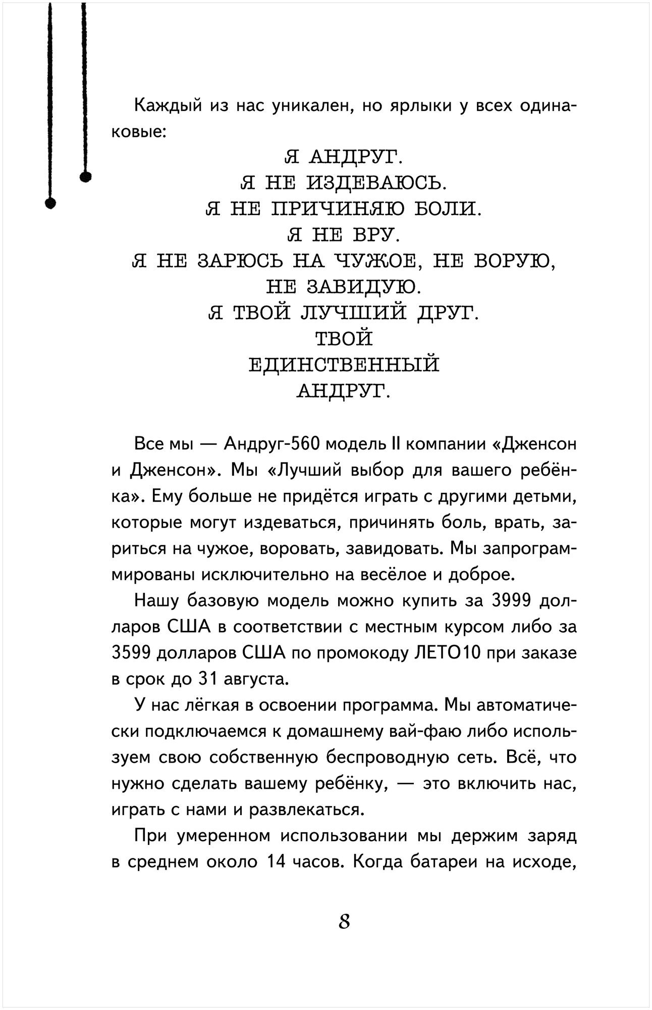 Очень необычная книга и по сюжету и по повествованию, ведь история рассказана от лица робота. И мне кажется это именно то, что сразу цепляет детей, когда они берут в руки книгу. По крайней мере с моим ребёнком именно так и получилось. Написана она просто и интересно, подняты проблемы дружбы, одиночества, не простых взаимоотношений с родителями. А ещё она заставляет о многом задуматься.