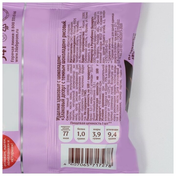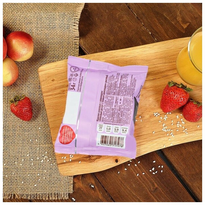 Удобный перекус в любом месте – легкий вес (34г) и компактная форма продукта (2 штуки в упаковке) позволяет положить его даже в маленькую сумочку.