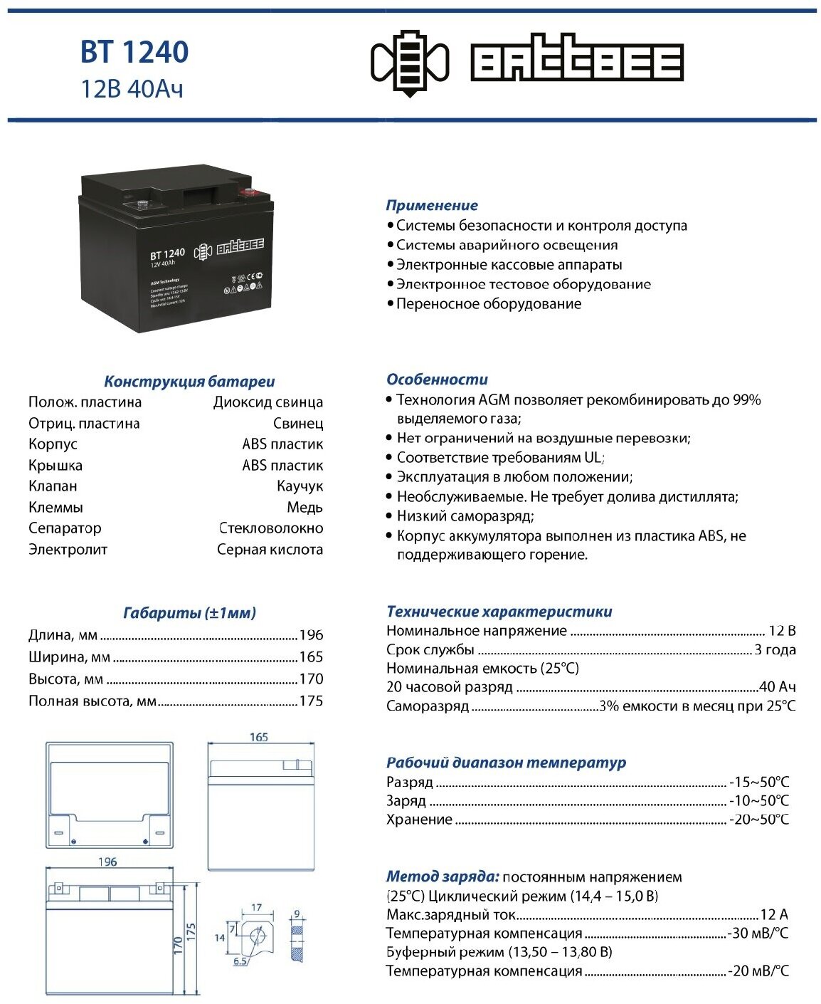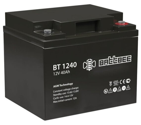 | Стандартная ёмкость при токе 10-часового разряда | 40 Ач |