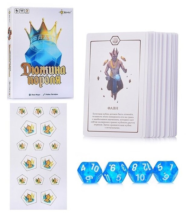 "Дюжина короля" - это тактическая настольная игра, в которой вам предстоит предугадывать действия соперников в борьбе за наибольшее значение вашего кубика. Каждый ход игроки разыгрывают 1 из своих карт, меняющих значение кубиков игроков на столе. Для победы в игре необходимо стать победителем в 2 раундах.