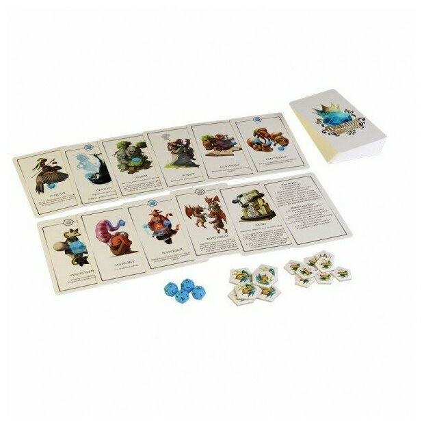 - Игрок с наибольшим значением кубика побеждает в ходу и получает победные очки. Затем игроки вновь выбирают карту с руки и выкладывают ее на стол лицом вниз.