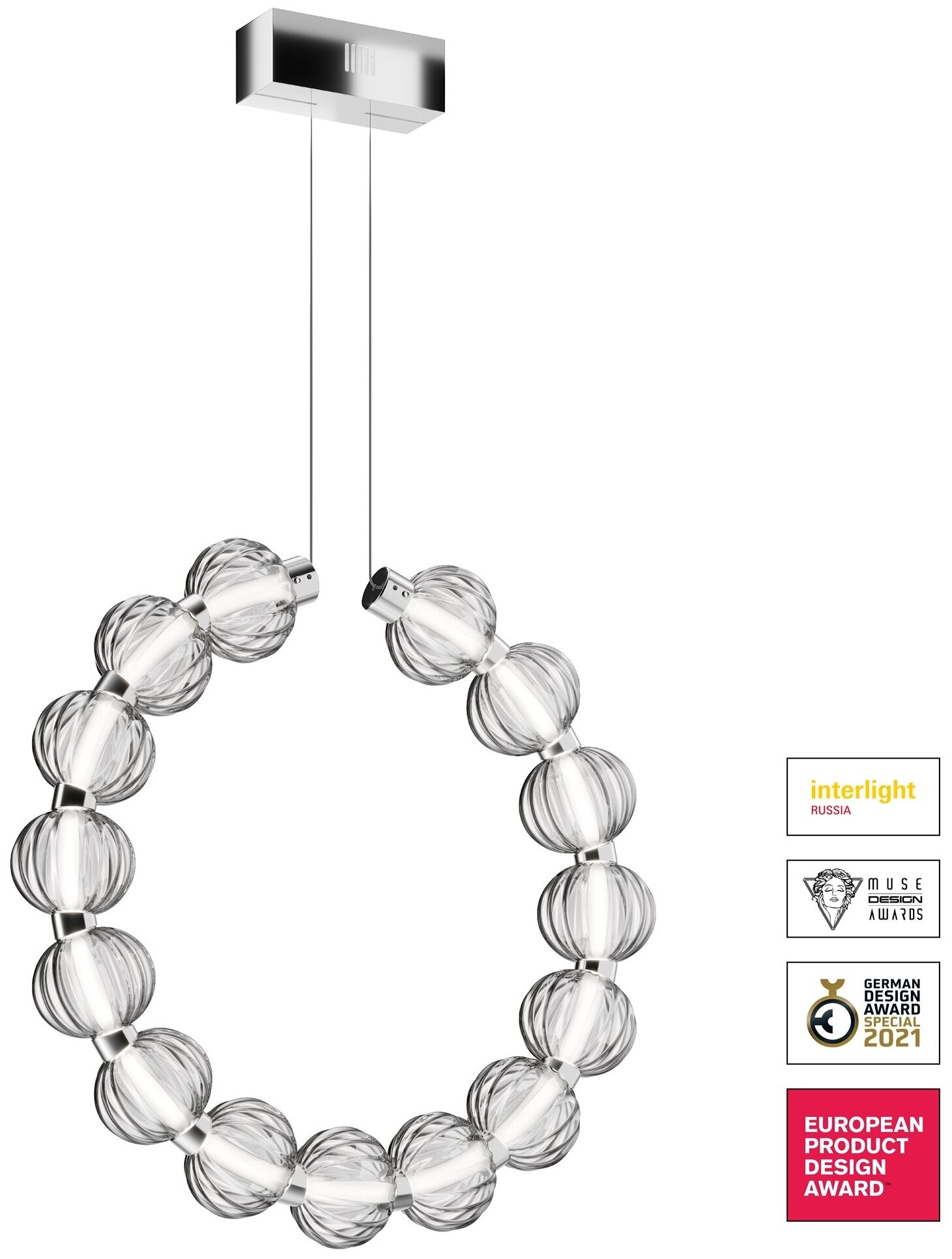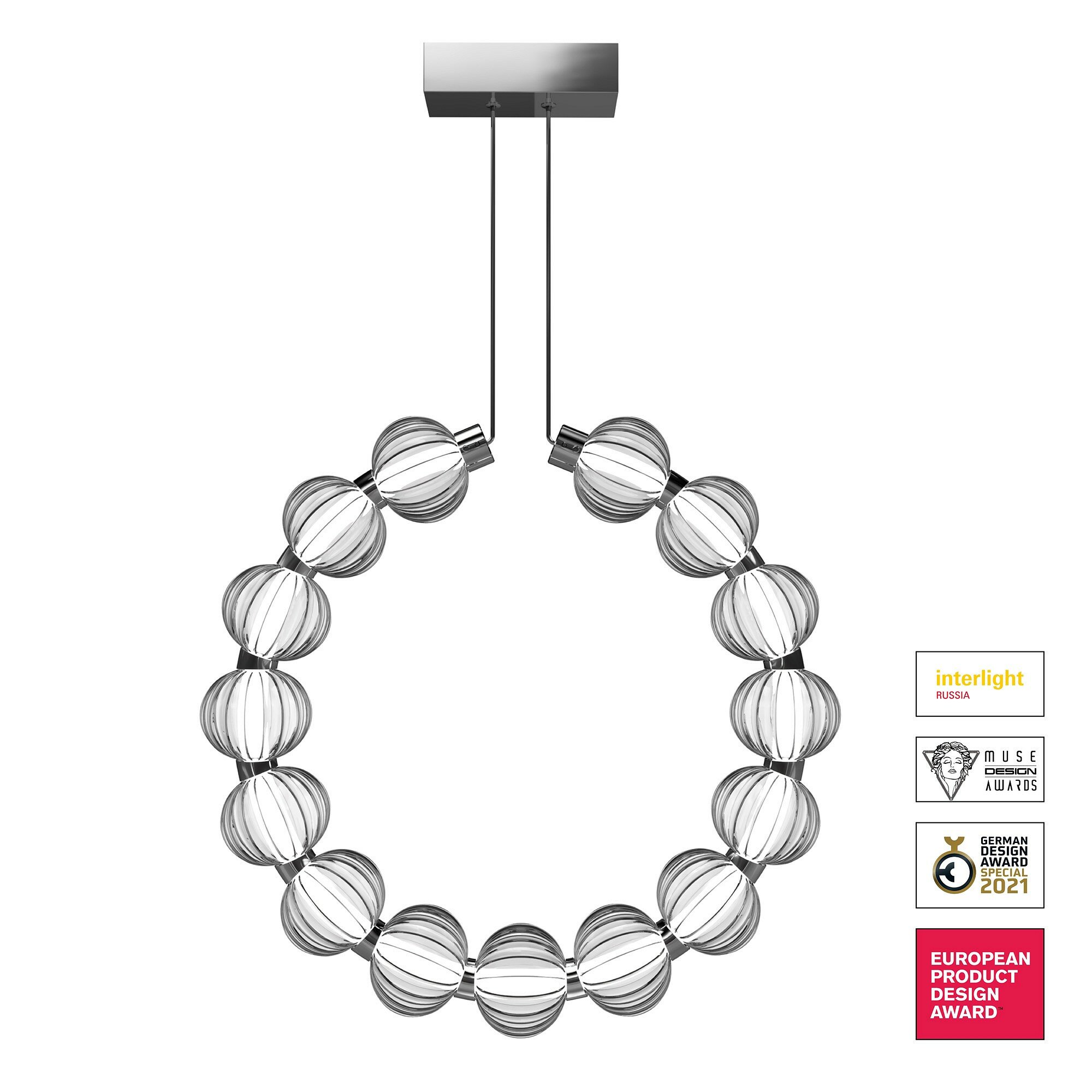 Этнические силуэты традиционных африканских украшений, наделенных тайным смыслом, легли в основу дизайна серии Amulet. Символика оберега, приносящего удачу и являющегося защитником дома, органично укладывается в канву современных интерьерных трендов, что подтверждают несколько международных премий. Акцентные декоративные элементы в виде рельефных сфер выполнены из литого стекла. Декор добавляет композиции визуальной легкости. Источник света – светодиодная лента – заключена в матовый акриловый рассеиватель. Такое решение обеспечивает мягкое освещение, а температура 4000К, близкая к дневному свету, идеальна для повседневной жизни. Серия включает подвесные светильники, высота которых регулируется при помощи тросов, а также настольную лампу.